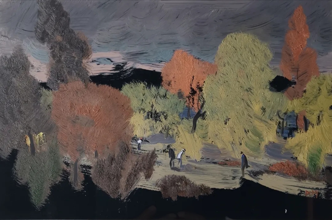 他的風(fēng)景畫都很小。都很晦暗。第一次見到時,感動于小小畫面中的深邃,卻有一點點想要保持距離。余德明的畫,色彩中能夠見到線條,仿佛是風(fēng)中的沙粒輕輕滑過面龐,卻在無意中感受到力量?;薨档纳搅种?,寥寥數(shù)筆,就寫盡了風(fēng)景,無盡黑暗中的景色自然而然就浮現(xiàn)在你的眼前,仿佛有無盡的話要訴說,又仿佛一個木訥的老者,有著支撐著龐大的身軀,卻再也不愿說出一句話。