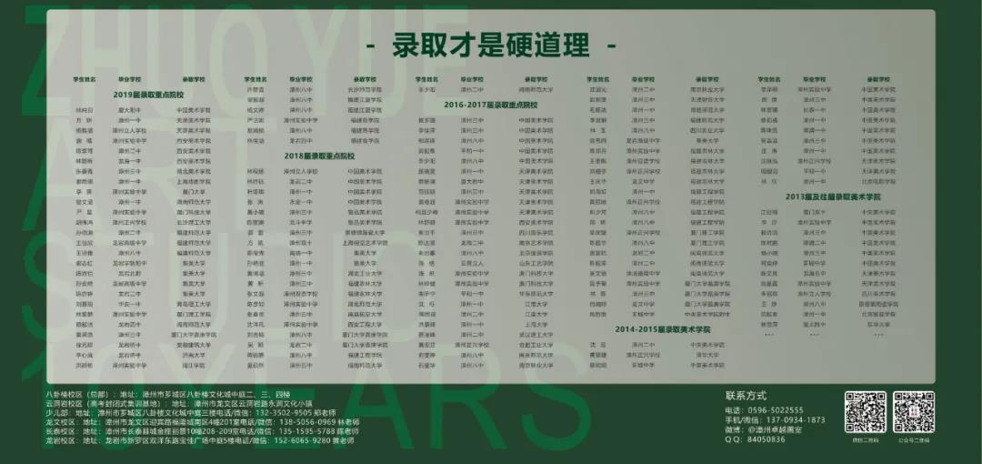 高考部(云洞巖校區(qū))位于國(guó)家4A級(jí)風(fēng)景旅游區(qū) — 云洞巖,建筑面積15000平米,配套有籃球場(chǎng)、電影院、展廳、藝術(shù)家工作室、食、宿和文化教學(xué)于一體,實(shí)行封閉式教學(xué)管理。是漳州第一家也是唯一的一家封閉式高考集訓(xùn)基地,是學(xué)藝術(shù)的理想圣地;總部(八卦樓校區(qū))分別有基礎(chǔ)部和少兒部,位于省級(jí)文化產(chǎn)業(yè)示范基地---八卦樓文化城內(nèi),教學(xué)面積共有1000平米,分層次,分學(xué)科,因材施教,系統(tǒng)規(guī)范。卓越畫(huà)室還擁有龍巖校區(qū)、龍文校區(qū)、長(zhǎng)泰校區(qū),為當(dāng)?shù)貙W(xué)生提供優(yōu)質(zhì)學(xué)習(xí)平臺(tái)。