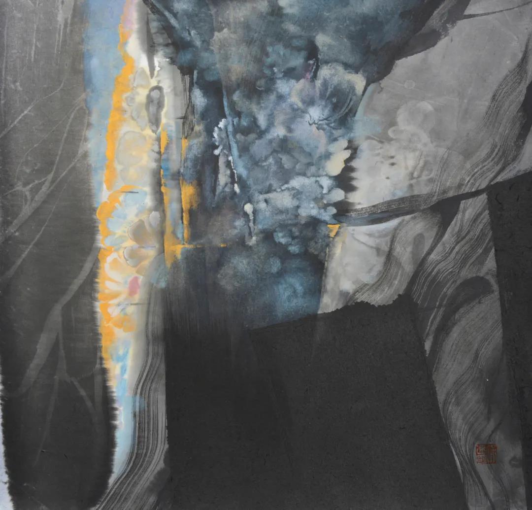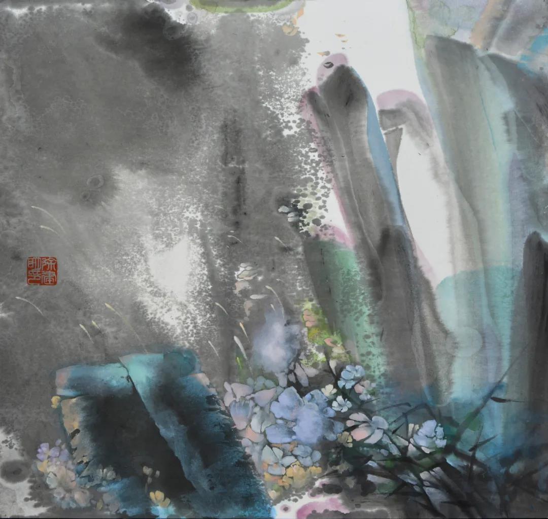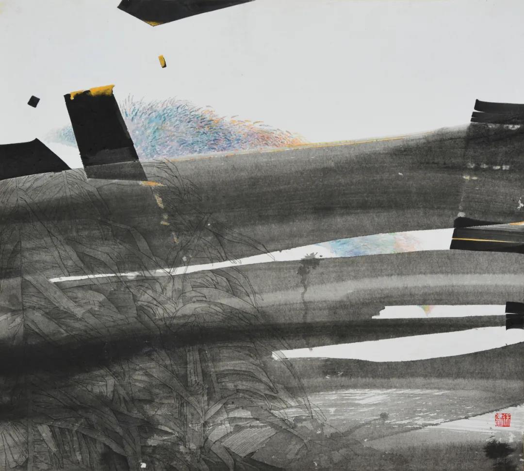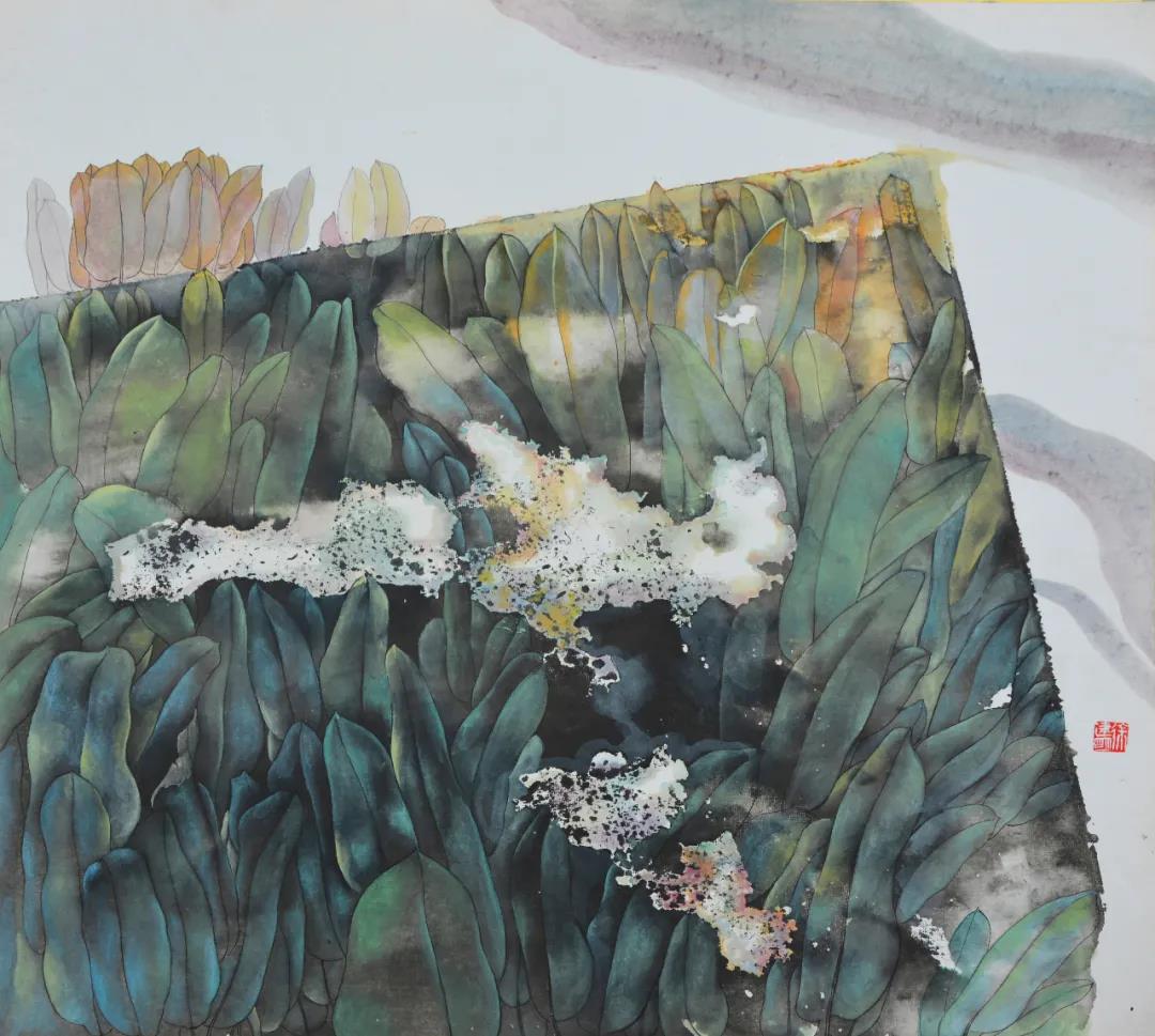 這時候具象(比如花卉)的建構過程實際上也是在限定之下尋找新的色彩關系和形式關系的過程,也逼迫具象物因與畫面發(fā)生和諧的關系而無法完全具象化。在技術上,他使用了刷、印、粘等非常規(guī)技法處理中國畫顏料,材料與顏料之間新的關系開始發(fā)生并擁有其獨立性而非為單純?yōu)樵煨头?。這就構成一種“離象“的狀態(tài),一種似是而非的圖式關系。