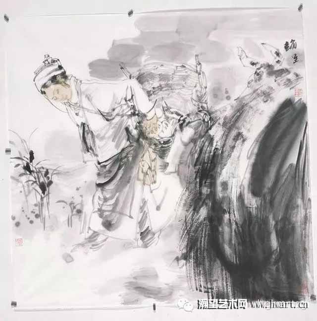 引人注意的是,趙星的作品緊緊把握著中國藝術(shù)特有的含蓄與空靈感,強(qiáng)調(diào)的是“得意忘形”、“意到筆不到”、“畫外之境”等等,淋漓處率性揮灑、任意潑墨,細(xì)致處精微傳神、氣韻俱足,用筆靈活,富于變化,筆線在虛實(shí)之間若即若離,結(jié)構(gòu)處輔以皺擦,使以筆立骨的寫意手法,結(jié)實(shí)、穩(wěn)定,而不渙散;用墨以潑墨和濃淡相破手法為主,營造枯、濕、濃、淡的豐富變化及水法帶來的墨色幻化,在一片墨韻、墨氣之中襯托人物關(guān)系,使畫面產(chǎn)生流動感,打破了靜止?fàn)顟B(tài),在運(yùn)動中使畫面頓生蓬勃之氣韻。