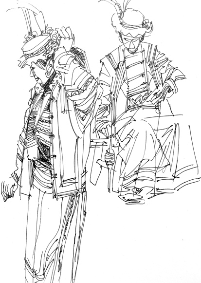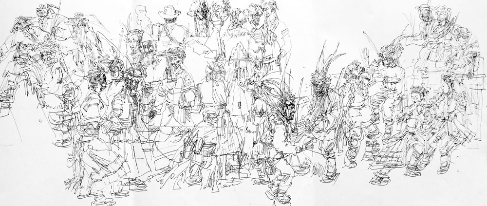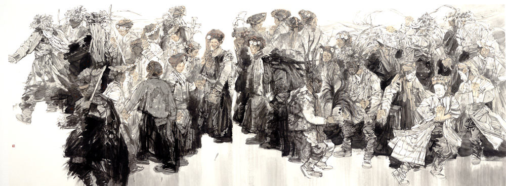 作為中國(guó)畫(huà)家,趙星表現(xiàn)出對(duì)水墨異乎尋常的敏感、敏銳,以他的出生和早年生活經(jīng)歷以及健碩的體格,原本似應(yīng)對(duì)強(qiáng)悍渾厚表現(xiàn)出與生俱來(lái)的偏好,但改變了生活環(huán)境的趙星,對(duì)于藝術(shù)語(yǔ)言掌控的變化顯得十分自然,甚至表現(xiàn)出優(yōu)于南方畫(huà)家對(duì)水墨的認(rèn)識(shí)理解。然而他熱衷的題材媒介,卻是生活在高原和西南的少數(shù)民族豐富多彩的生活情態(tài),有趣的是,趙星過(guò)濾去鮮明的色彩,還以單純的水墨,又以快捷勁挺的細(xì)線(xiàn)結(jié)構(gòu)造型,并且善于營(yíng)造澄明淋漓的水暈?zāi)滦Ч?,令人稱(chēng)奇。近年來(lái)趙星注重了用筆用線(xiàn)的厚重與蒼勁,兼以大塊墨色對(duì)比,突出了畫(huà)面主次和層次效果,取得明顯進(jìn)展。