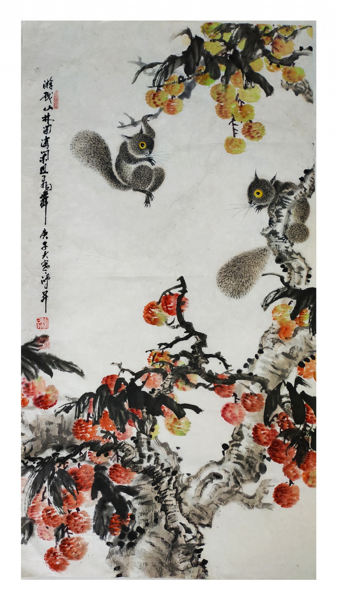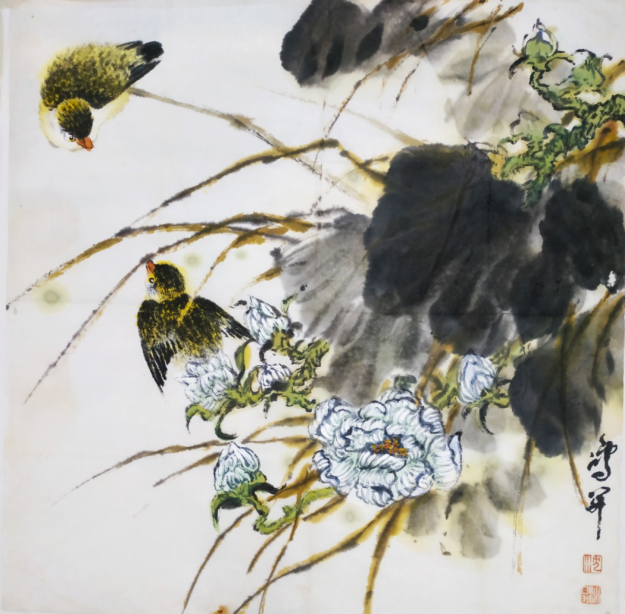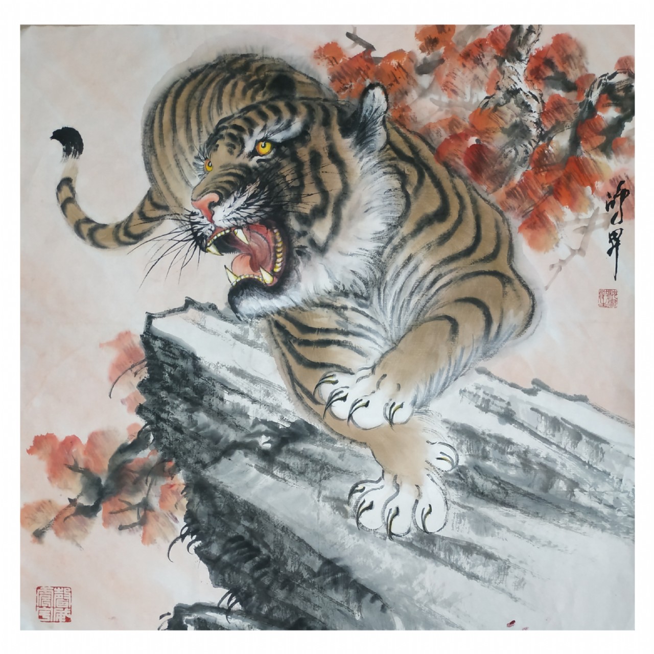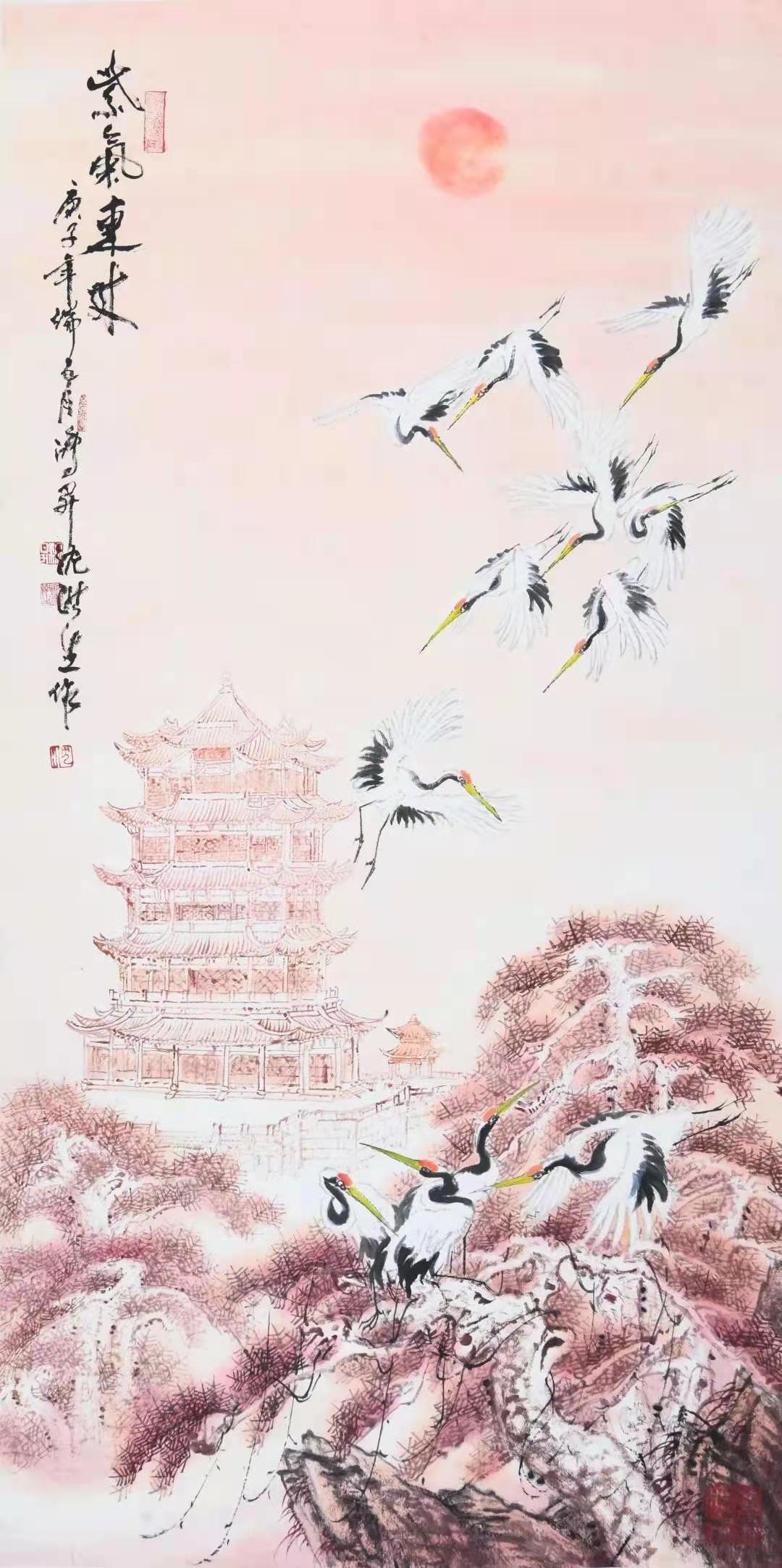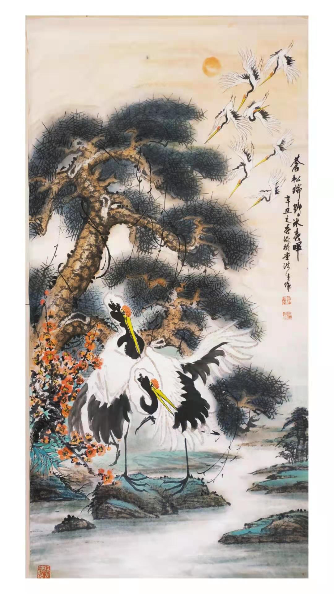筆墨體現(xiàn)的是作者的個(gè)性。沈鴻昇的山水畫用色的妍雅和筆墨秀潤(rùn)同樣在他的花鳥畫中得到再現(xiàn)。他在講究筆墨的同時(shí),也借花鳥寄興。試看他筆下的“虎”,在山林間或奔騰或長(zhǎng)嘯,或閑庭信步或傲視云海的虎,是那么驍健和野趣橫生。如果說這就是“虎威”,還不如說這是作者對(duì)百獸之王的敬畏和贊美;鴻昇畫鷹,也畫出了它的雄偉高昂的氣勢(shì),是一種對(duì)氣派、力量、神勇的歌頌,鴻昇畫鶴、畫松鼠以及其他一些小動(dòng)物,表達(dá)了他對(duì)自然生靈的愛憐和對(duì)世間萬(wàn)物天趣和諧的慰藉。為了表現(xiàn)無(wú)限的想象,他這些畫用筆亦多率意。我們觀其狀物,即知其意欲在“寫心”。鴻昇畫花鳥,用筆輕捷明快瀟灑,以形寫神,設(shè)色妍艷,又未嘗以傅色暈染細(xì)碎為工??偸鞘且圆话鍦母裾{(diào),自然而然的韻味表現(xiàn)之。無(wú)論是花卉還是走獸禽鳥之類,都能達(dá)到“神韻為上,且不失形似?!庇眯闻c色互相映隱,達(dá)到似之,故能佳。