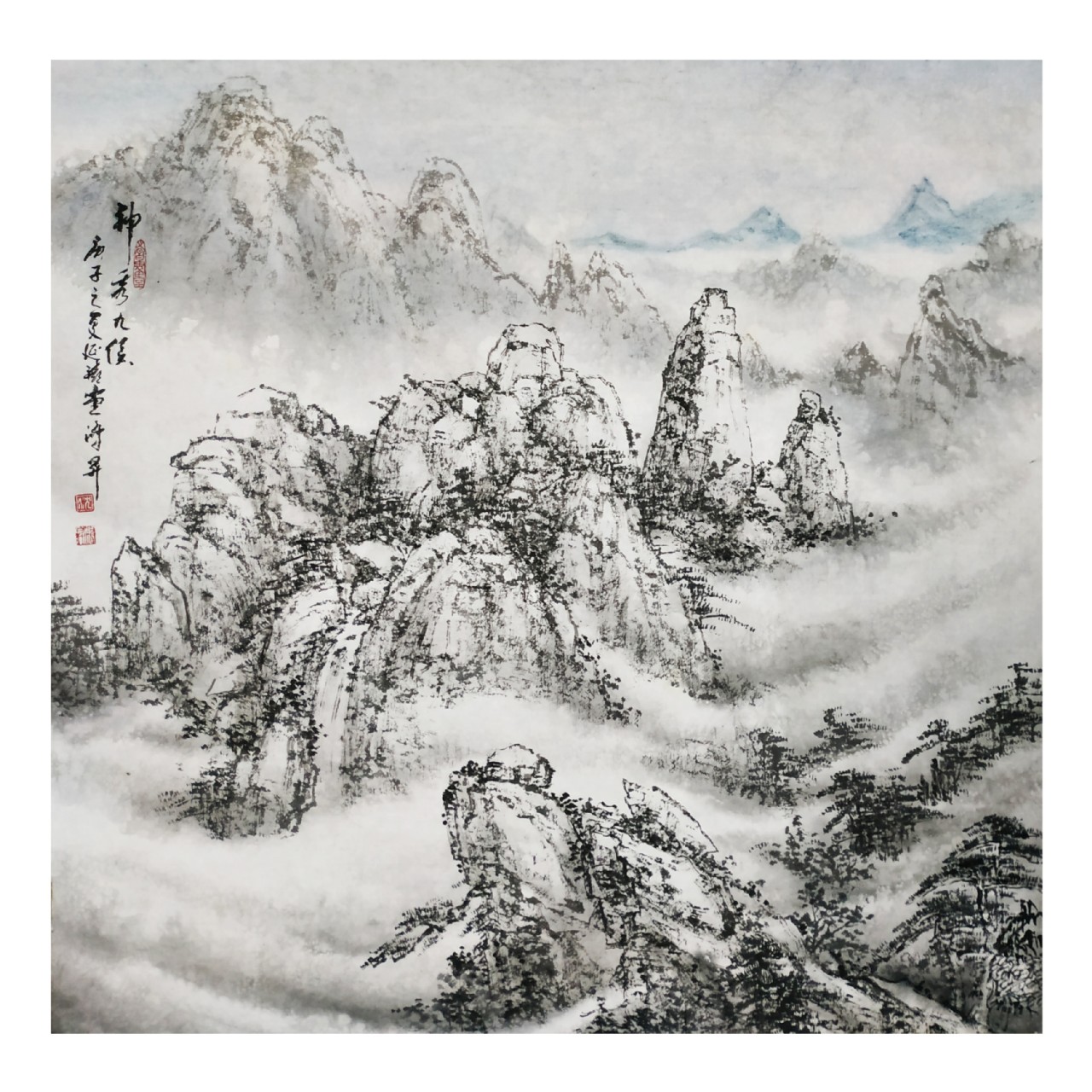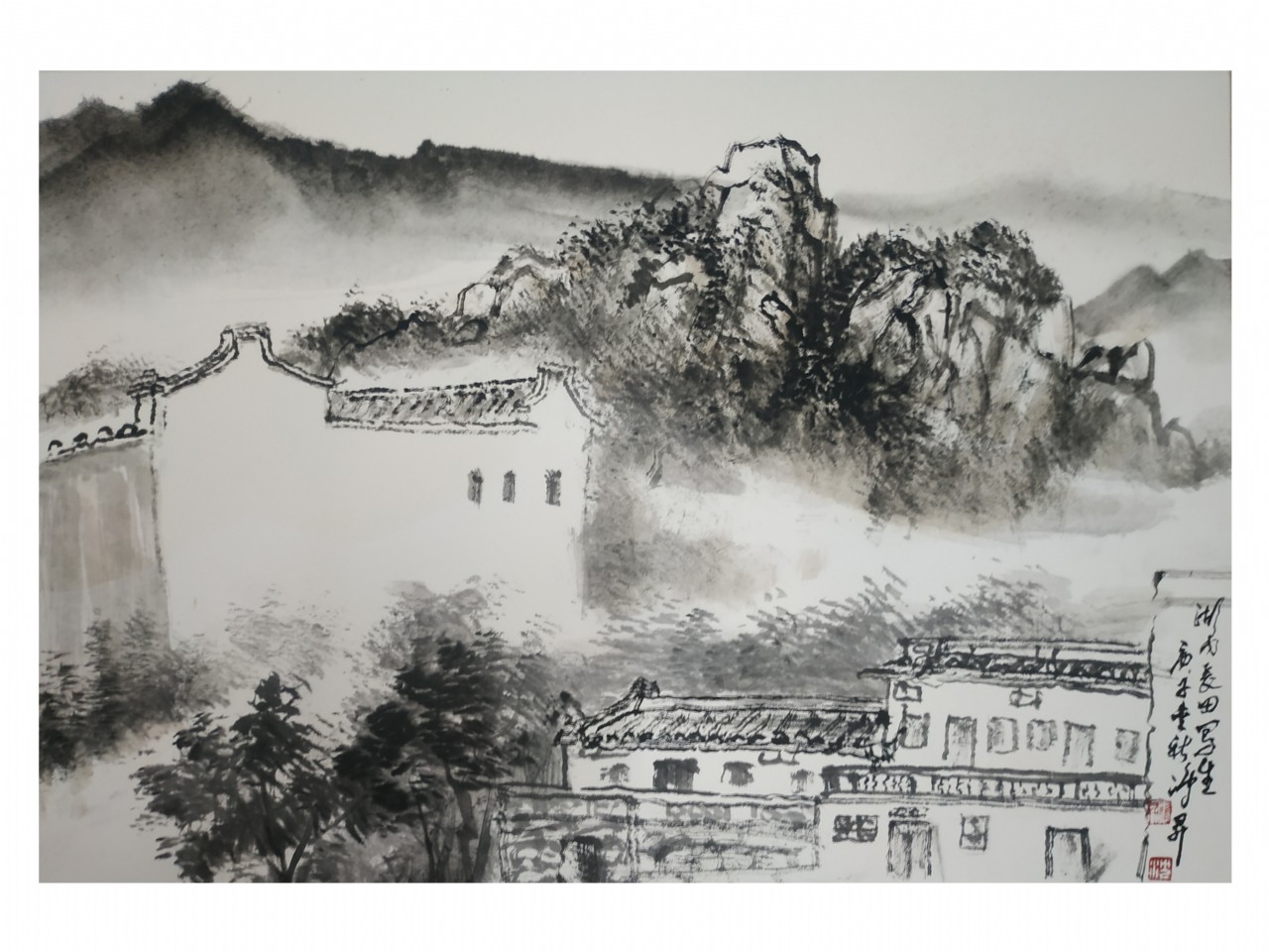 鴻昇學(xué)習(xí)傳統(tǒng),并沒有跌進(jìn)泥古的窠臼。他雖然傾心于傳統(tǒng)山水,尤其是明清山水畫風(fēng),卻不滯于傳統(tǒng)之下,而是恰到好處地利用自己足跡之所到所搜集的大量素材進(jìn)行傳統(tǒng)筆墨的對(duì)位,恰到好處地做到妙造自然?!毒藕钪铩樊嬍窃t安名勝古跡,畫面體現(xiàn)了峰回路轉(zhuǎn),云合水分的實(shí)況。章法上把九侯巖古廟宇置于中部,周圍黃色山花環(huán)繞著,巖下泉水潺潺,遠(yuǎn)處山嵐霧氣繚繞游動(dòng),令人神往。畫面上水與墨交融,氣韻生動(dòng)流暢。尤其是用色上的大膽,敢于用鮮明的黃色與墨色作對(duì)比,而且讓黃色在畫面上連綴,如象一條彩帶。墨與色相互映隱,色與墨既形成了強(qiáng)烈的對(duì)比,又很協(xié)調(diào)。新穎的藝術(shù)語(yǔ)言也同時(shí)帶來了現(xiàn)代感。。。。。。鴻昇還以扇面的形式畫了不少現(xiàn)實(shí)山水,雖屬小構(gòu),卻也都從生活中來,便讓人都覺得十分親切而可信。