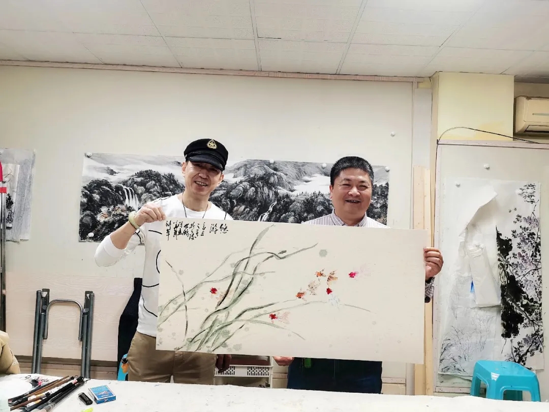 而后吳世鵬先生邀請導(dǎo)師吳華林先生一起創(chuàng)作,兩位導(dǎo)師潑墨揮毫,共同創(chuàng)作了兼工帶寫“悠游圖”,博得全體學(xué)員陣陣掌聲!