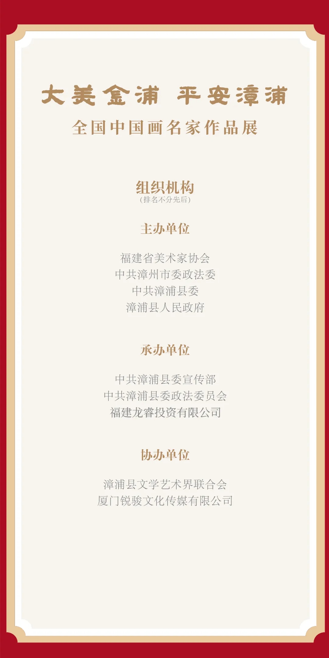 出席開幕式的領(lǐng)導(dǎo)有:中共漳浦縣委書記戴平忠、中共漳浦縣委副書記、漳浦縣人民政府縣長(zhǎng)黃慶華、漳浦縣人大常委會(huì)主任劉達(dá)文,漳浦縣政協(xié)主席林兆波,中共漳州市委政法委副書記王文智,漳州市文聯(lián)主席張文力,漳州市文聯(lián)副主席、漳州市書法家協(xié)會(huì)主席黃坤生、中共漳浦縣委常委林蘇洪、漳浦縣人民政府副縣長(zhǎng)、漳浦縣公安局局長(zhǎng)陳偉強(qiáng)、漳浦縣人民政府副縣長(zhǎng)鄭世然、漳浦縣人民法院院長(zhǎng)邱小斌、漳浦縣人民檢察院檢察長(zhǎng)歐陽偉。