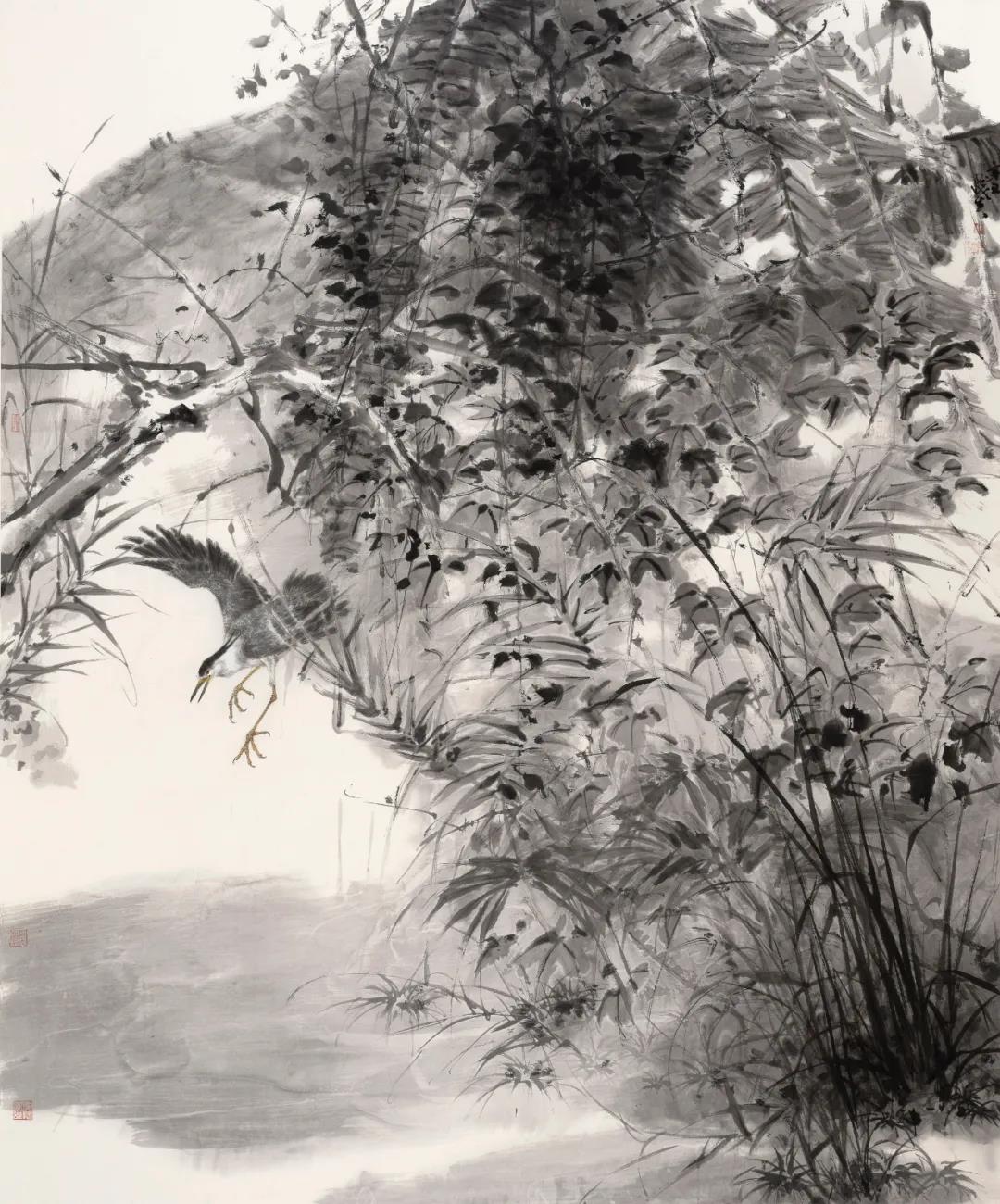 彼時(shí),在北京畫院鄭雅風(fēng)工作室的教學(xué)區(qū),在帶領(lǐng)學(xué)生目識(shí)心記的寫生過(guò)程中,在一起觀摩歷代畫作的展覽中,在談笑生風(fēng)的答疑解惑中,總是活躍著師徒式的言傳身教,筆耕不輟。鄭雅風(fēng)先生始終強(qiáng)調(diào)中國(guó)畫的寫意造境與筆墨功夫,追求意境與格調(diào)。近期作品秉承其一貫的野趣雅韻,又更加豪邁放逸,一氣呵成,驅(qū)墨如云,輕重濃淡,疏密干濕,萬(wàn)千變化。枝葉花草愈發(fā)不求形似,恰如“隔岸觀花”,平添無(wú)盡意蘊(yùn)?!鞍丁辈⒎鞘墙缦?,是與物象之間的一層輕紗、薄霧、細(xì)雨、疏煙,也正是“隔岸”,方能更好的表達(dá)繪畫的抽象尺寸,有了不同程度的距離去看物象,才能夠更深刻的感受似與不似的畫境之微妙。