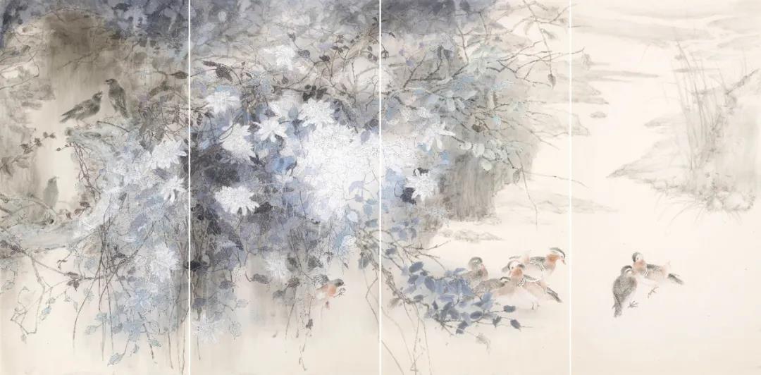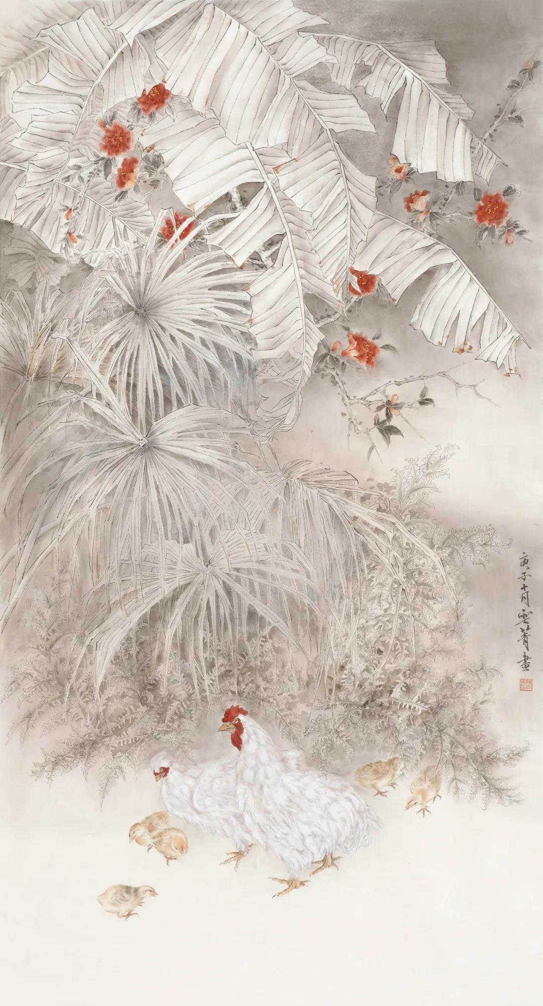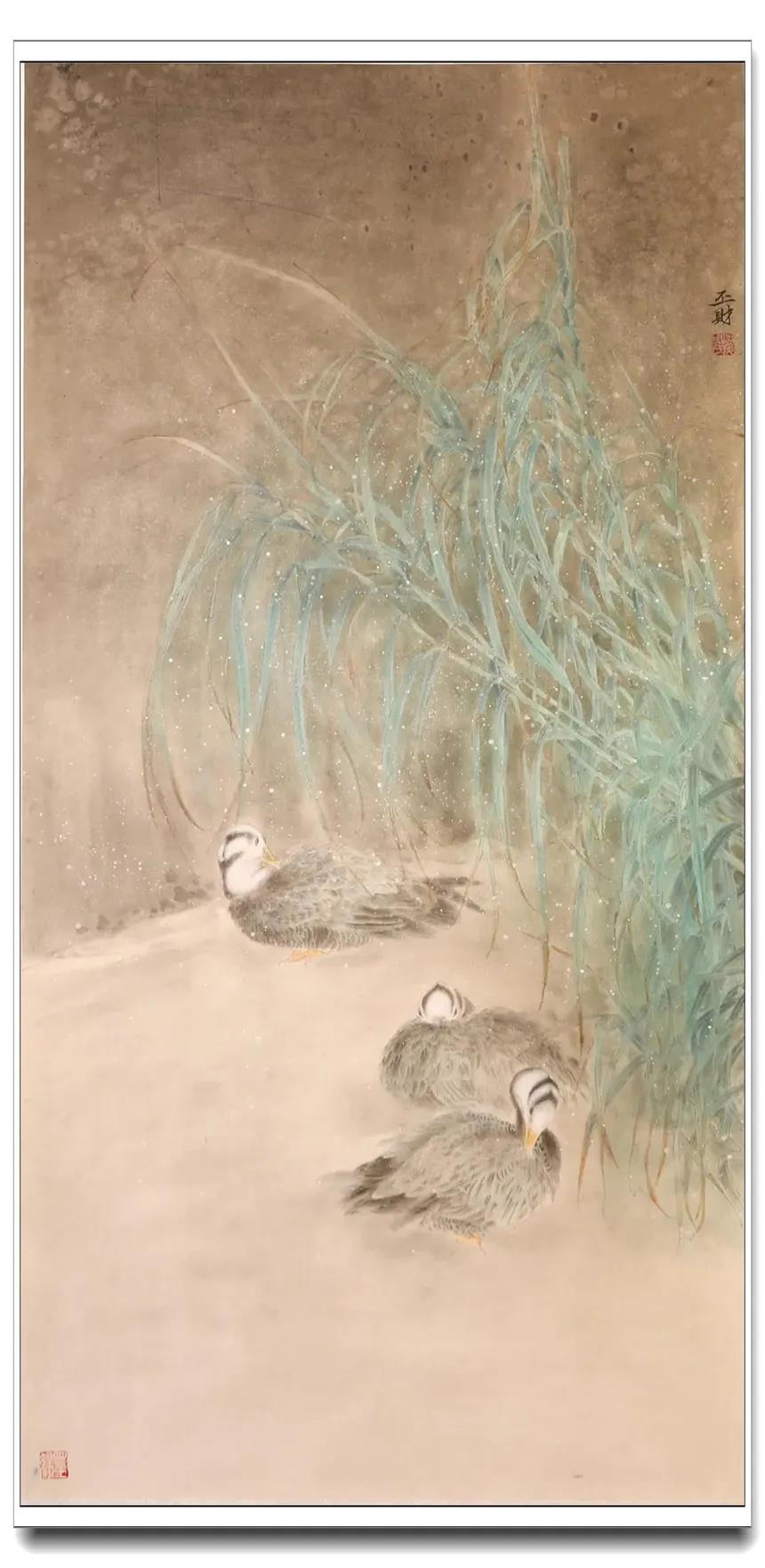 時(shí)光流轉(zhuǎn),學(xué)生們無(wú)論年齡長(zhǎng)幼,無(wú)論求學(xué)路途遠(yuǎn)近,無(wú)論聰慧愚鈍,均虛心請(qǐng)教,孜孜以求,筆勤不殆。數(shù)年下來(lái),亦有所進(jìn)益,更有不可同日而語(yǔ)之大進(jìn)步。老師亦為所悅,親選學(xué)生代表作品參與本次展覽,以示鼓勵(lì)勸進(jìn)。此次畫展,共展出北京畫院鄭雅風(fēng)工作室?guī)熒?00件作品,學(xué)生作品尺幅從扇面小品到2米大幅全景花鳥(niǎo),僅以示求學(xué)之所成,教學(xué)之印記,亦猶如一場(chǎng)永無(wú)止境的修行,得片刻休整,自此,便只顧風(fēng)雨兼程。