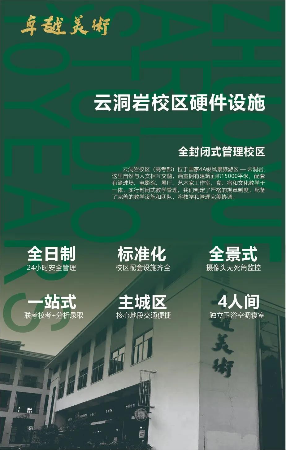 高考部(云洞巖校區(qū))位于國家4A級風景旅游區(qū) — 云洞巖,建筑面積15000平米,配套有籃球場、電影院、展廳、藝術家工作室、食、宿和文化教學于一體,實行封閉式教學管理,是學藝術的理想圣地;高考部與全國美術高考領軍品牌- -白塔嶺畫室強強聯(lián)合,成立白塔嶺漳州校區(qū),實現(xiàn)資源互補,共同促進,讓漳州學子在家門口就可以享受更優(yōu)質(zhì)學習平臺!