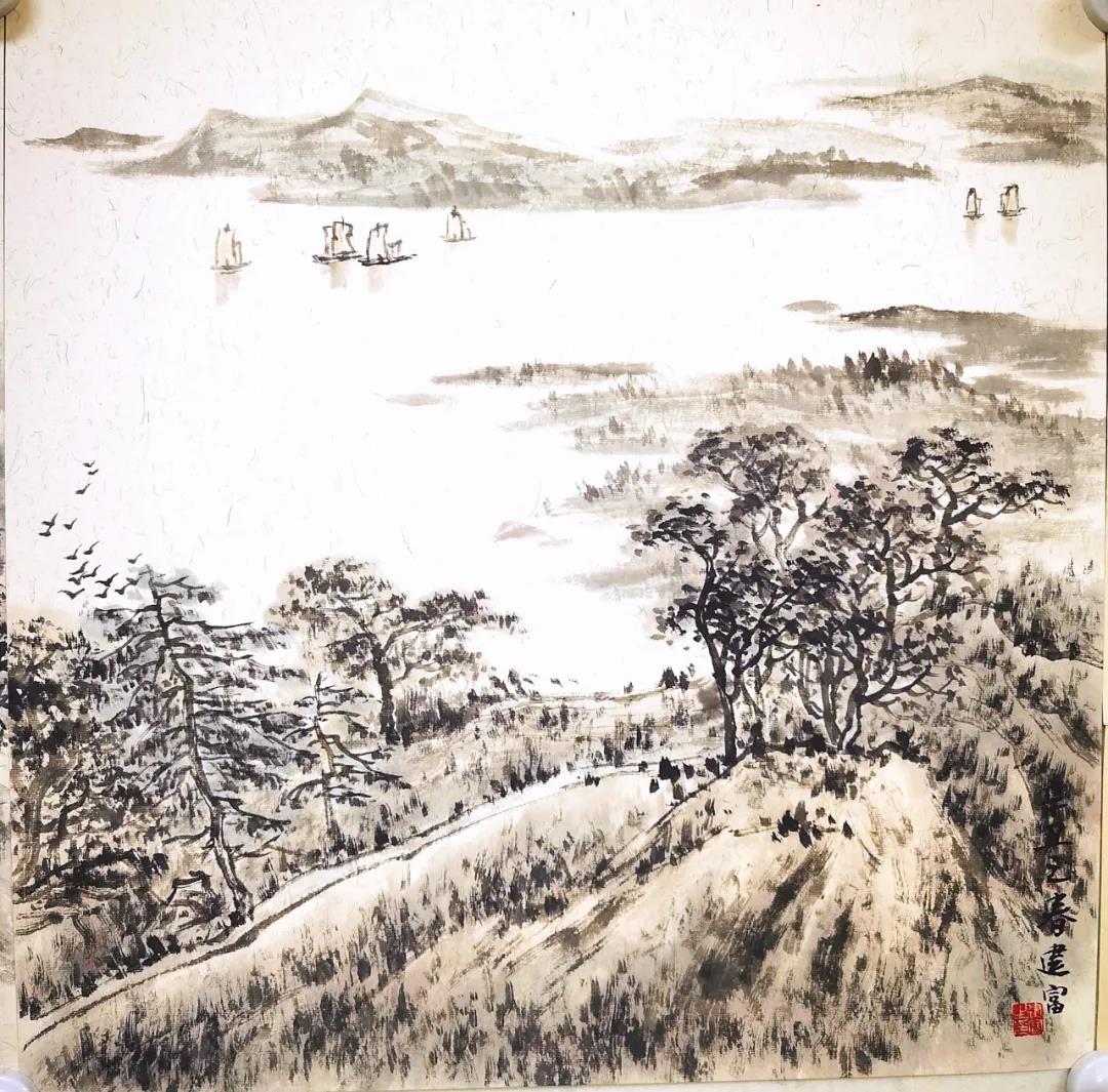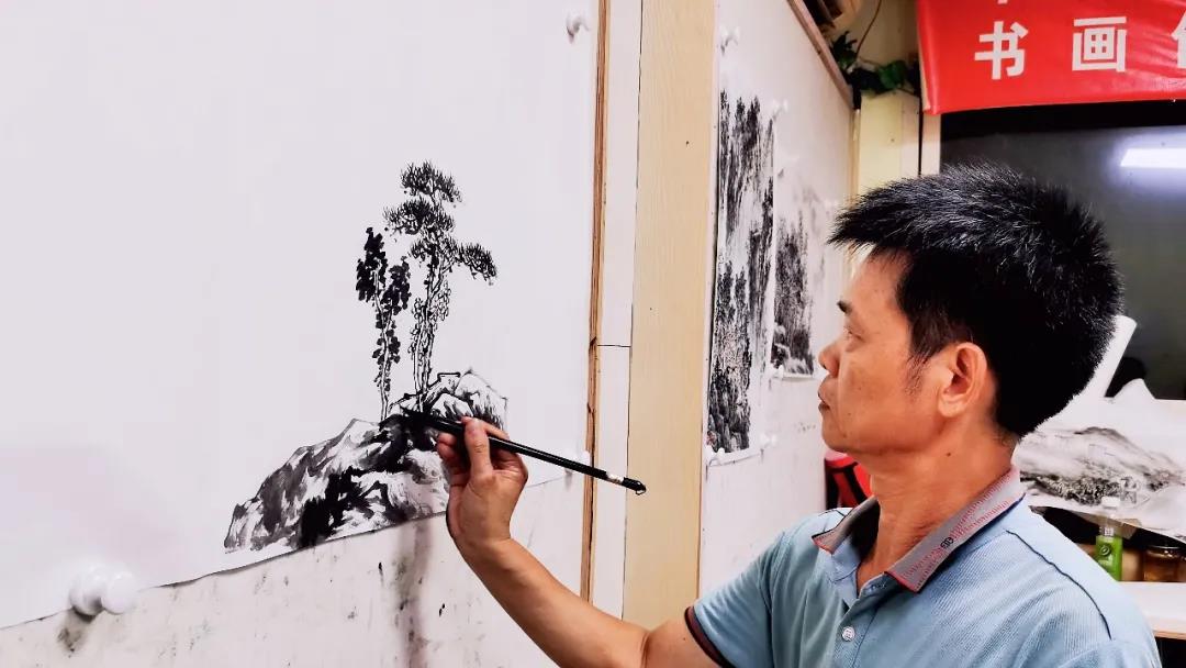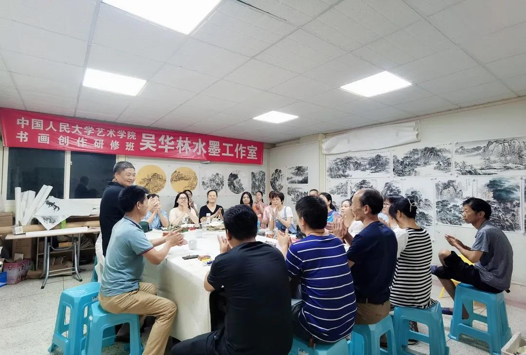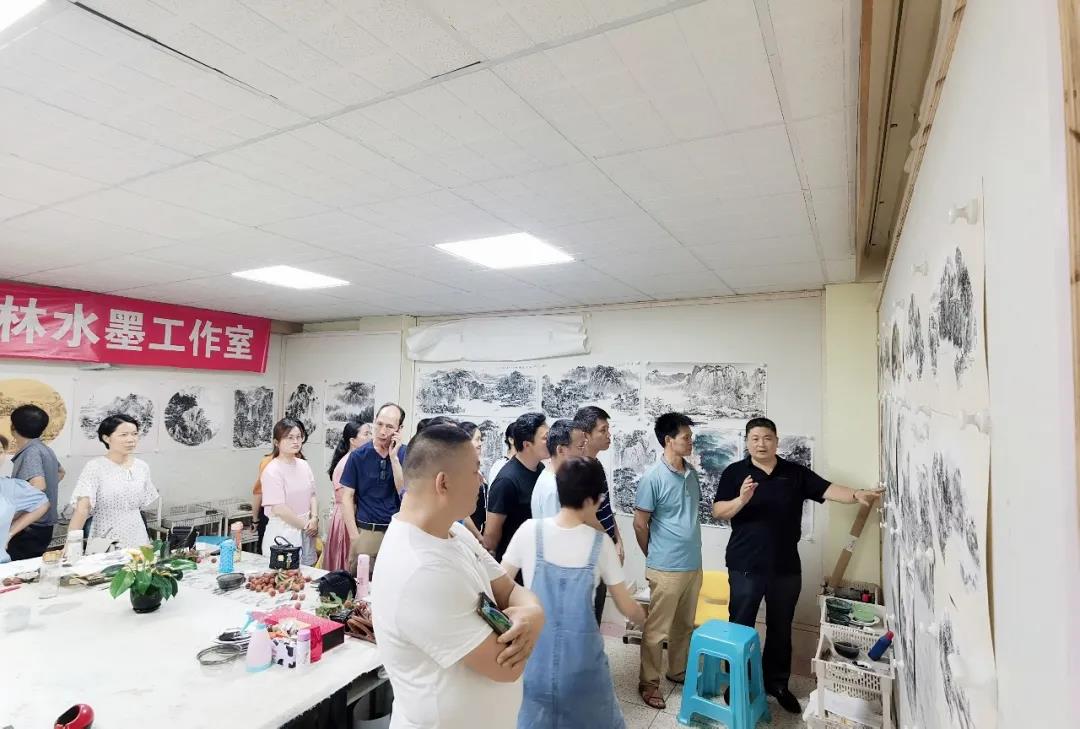.20日晚,漳江兩岸,燈火輝煌,江面碧波蕩漾,倒映著闌珊燈火。老橋邊上,吳華林水墨工作室,人頭攢動(dòng),不時(shí)爆出陣陣掌聲。畫家吳建富先生今晚應(yīng)邀做客吳華林水墨工作室,帶來近作三十幾幅與工作室學(xué)員講學(xué)交流并進(jìn)行創(chuàng)作示范。