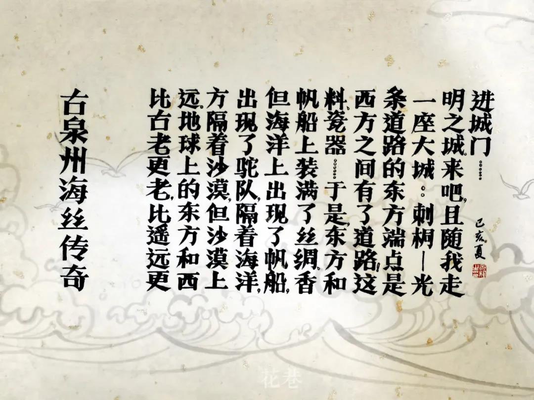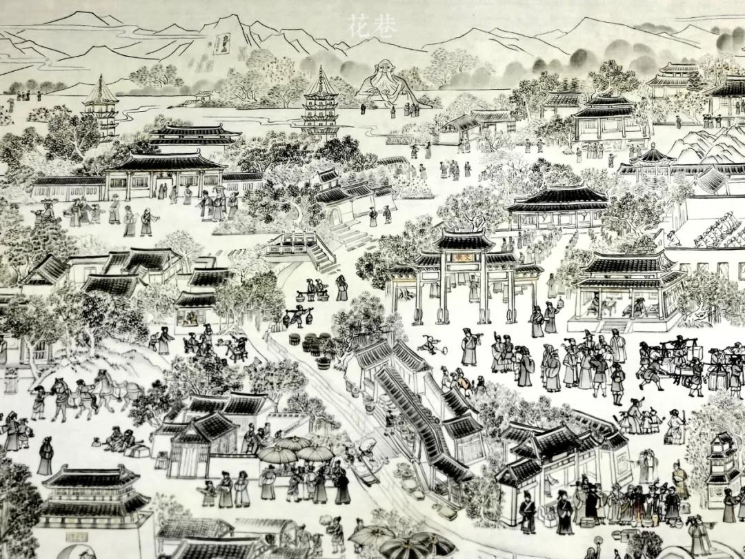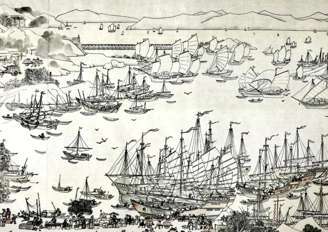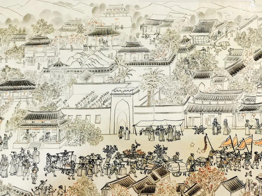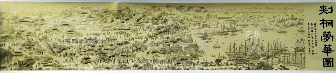 《刺桐夢華圖》畫卷以中國傳統(tǒng)文人畫的經(jīng)典藝術(shù)形式,細(xì)膩生動描繪了10—14世紀(jì),東方光明之城泉州,港口、城市、腹地之間的大聯(lián)動繁華盛景。畫卷中,刺桐港內(nèi)來自不同國家的各式商船匯集港口。七大城門守護(hù)的古城內(nèi),車水馬龍中,商貿(mào)、文化、生活互融互通。