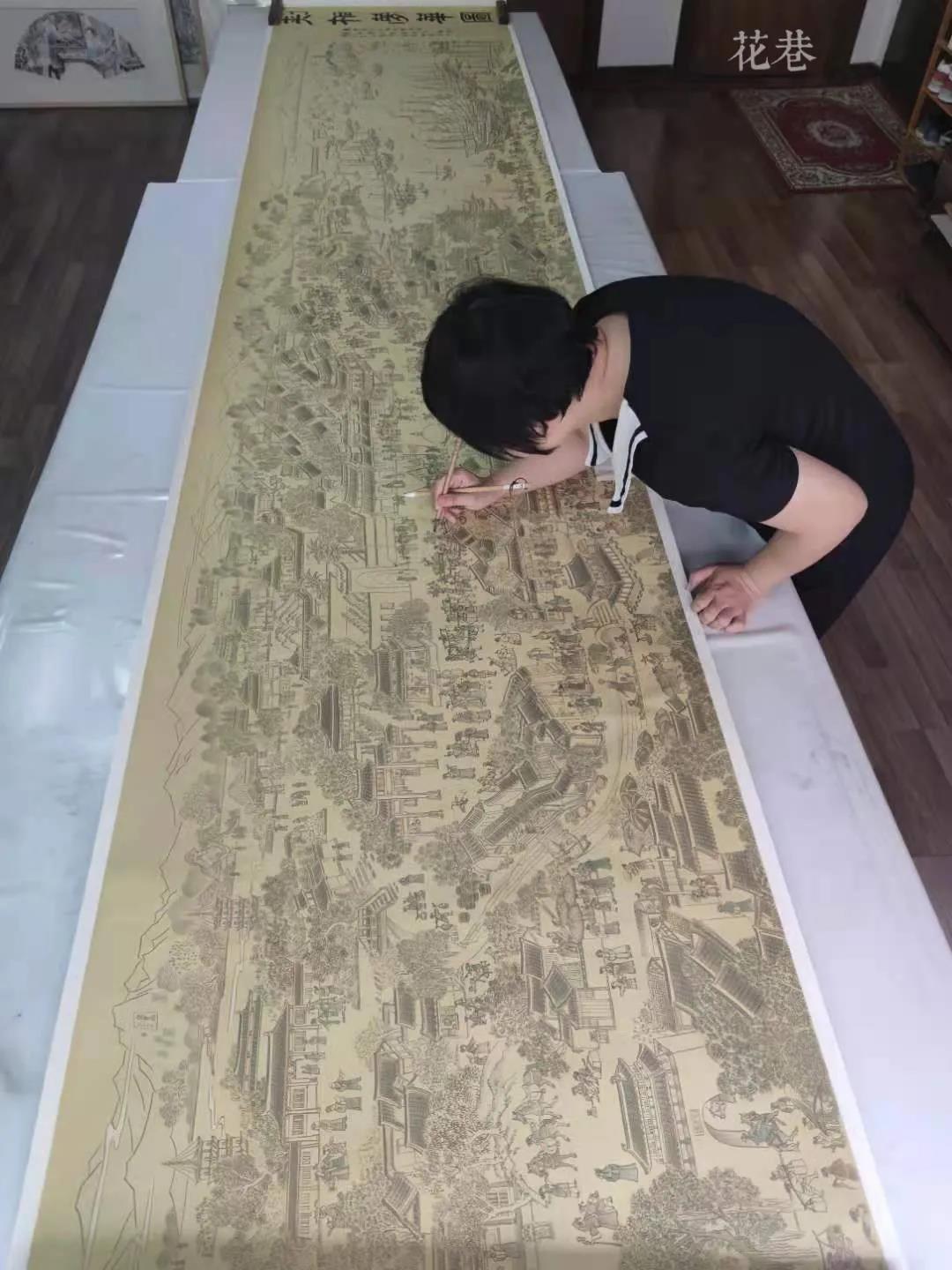 整幅畫卷分為多個場景。每個場景的創(chuàng)作都要耗費不少時日,每次到自己分解的繪畫環(huán)節(jié),他們都要各自將巨幅絹畫帶回家里創(chuàng)作。但是,兩位教授各自的工作室有一定距離,每隔一段時間就會出現(xiàn)有趣的一幕:幾個人抬著一巨幅畫作送上一輛三輪車,然后護(hù)送著畫作穿梭街巷、爬樓梯。