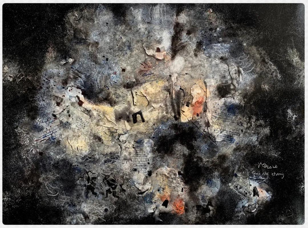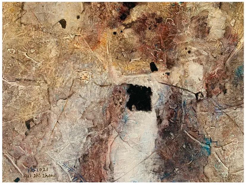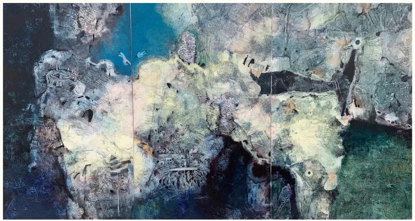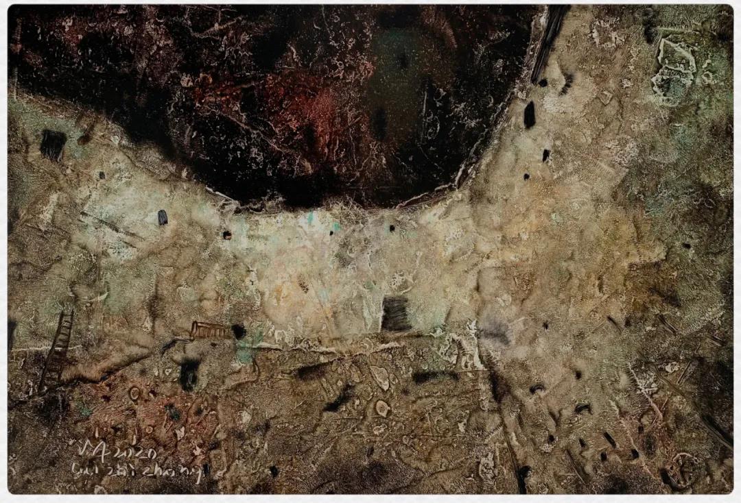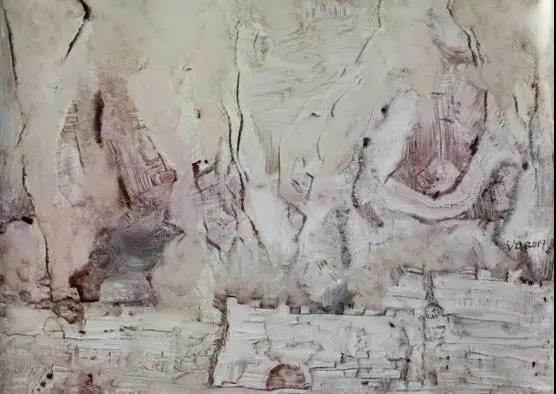崔治中的憂患意識(shí)使他的作品具有鮮明的憂郁品格。他筆下少有歡快明朗的色彩,幾乎無(wú)紅日、紅花、雄鷹、旌旗等意象。在低沉、冷調(diào)、灰暗的色調(diào)中,勾勒長(zhǎng)城的某一局部或幻化成墻、城、海、泉、船、車、梯、路、煙等相融的敘述構(gòu)成,除了那隨處隱約可見(jiàn)的三角形階梯的直線條,歲月漩渦中的城墻磚石、山川草木、船體漿聲,都在歷史風(fēng)云中或流轉(zhuǎn)或枯寂或掙扎或眺望,看似隨意的信筆而就,卻飽含著畫家深邃而憂傷的情感?!尔}池烽火臺(tái)》的銅銹感,畫出了戰(zhàn)火磨礪后依然能頂住坍塌的不屈意志;《又是花開時(shí)》的石墻蜂孔與頑強(qiáng)生長(zhǎng)在石縫中的小黃花,表達(dá)了時(shí)間深邃黑洞的遙遠(yuǎn)過(guò)去和此在新蕊的鮮明對(duì)比,表明歷史往往是活在當(dāng)下的思考;《金色寓言》中枯藤、嶙峋、斑駁陸離的黝黑基石上生長(zhǎng)的層層不規(guī)則黃色巖石上方,飄浮著靈動(dòng)的金色霽霧,給人以溫暖的希冀,那上下部強(qiáng)烈的冷暖色差,述說(shuō)著寓言的嚴(yán)酷與冷峻。這些作品有一個(gè)共同的審美指向:歷史的刻痕永遠(yuǎn)無(wú)法在歲月中消逝,我們所感受到的只是自我認(rèn)知的歷史。因此,崔治中的圖像模糊與符號(hào)信息所扭結(jié)的畫作,也僅僅是畫家的個(gè)人體悟和表達(dá),給予人們的是閱讀鑒賞和引發(fā)思考。這也許是崔治中作品的獨(dú)特之處和價(jià)值所在。