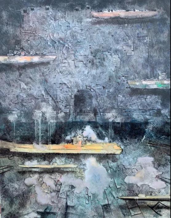 看了崔治中的作品,他這些具有思辯性、探索性、符號(hào)性的畫作,既不同于寫實(shí)主義的機(jī)械反映,又區(qū)別于表現(xiàn)主義的內(nèi)心抒寫。他立足于“長(zhǎng)城”這一隱喻符號(hào),把征戰(zhàn)、戰(zhàn)火、防御、固守、開放、藍(lán)海、夢(mèng)想等渲染其中,以表達(dá)他的視覺(jué)歷史觀,盡管這種視覺(jué)歷史觀或有偏頗或有模糊或有虛幻,但他的美學(xué)呈現(xiàn)卻是耐人尋味的?!豆廨x歲月》中那若隱若現(xiàn)的駿馬正從滄桑的城墻中奔騰而來(lái),粗壯奔放的光芒給人以凝重和刺破之感;《大漠風(fēng)煙》的明亮色彩與黃沙暖煙相一致,時(shí)鐘嵌入墻體的歷史寓意十分明顯,以表達(dá)長(zhǎng)城在蒼穹空曠之下的溫和柔軟性格,這是崔治中僅有的充滿暖色調(diào)的作品。他的《長(zhǎng)城依然在》《戈壁與海洋》《千船過(guò)》《城墻上的一支船》《沙海之舟》別有意味,他把山體與大海、沙漠與海洋、城墻與航船揉捏在一起,靜與動(dòng)、虛與實(shí)、固守與開放、黃色與藍(lán)色,形成鮮明對(duì)比,既表明船堅(jiān)利炮轟毀不了長(zhǎng)城,因?yàn)殚L(zhǎng)城守護(hù)著這方廣袤的土地,又表達(dá)畫家渴望擁抱大海、走向世界的期許。《沙海之舟》的寓言味道十分突出,殘酷的荒漠銹蝕了曾經(jīng)航行的舟楫,那斑駁朽爛的木船擱淺在沙海上不能動(dòng)彈,只能追憶曾經(jīng)擁有的藍(lán)天白云、綠波蕩漾,歷史的嚴(yán)峻性恰恰體現(xiàn)在這里:過(guò)往的一切已成史跡,留下的是歲月蝕刻的蒼涼印記。
