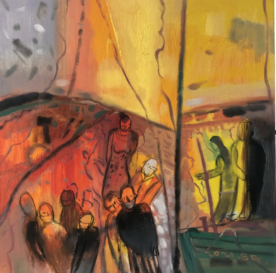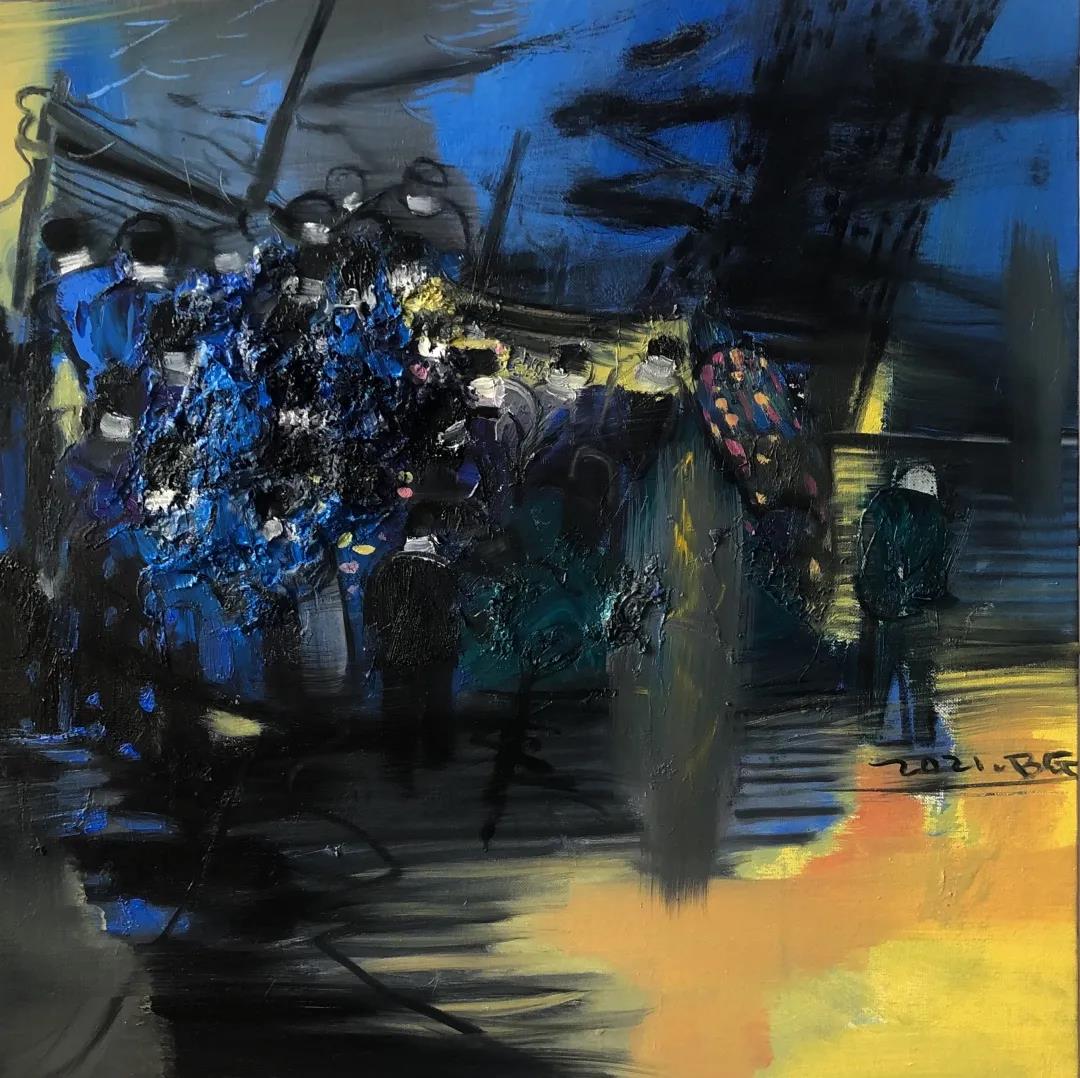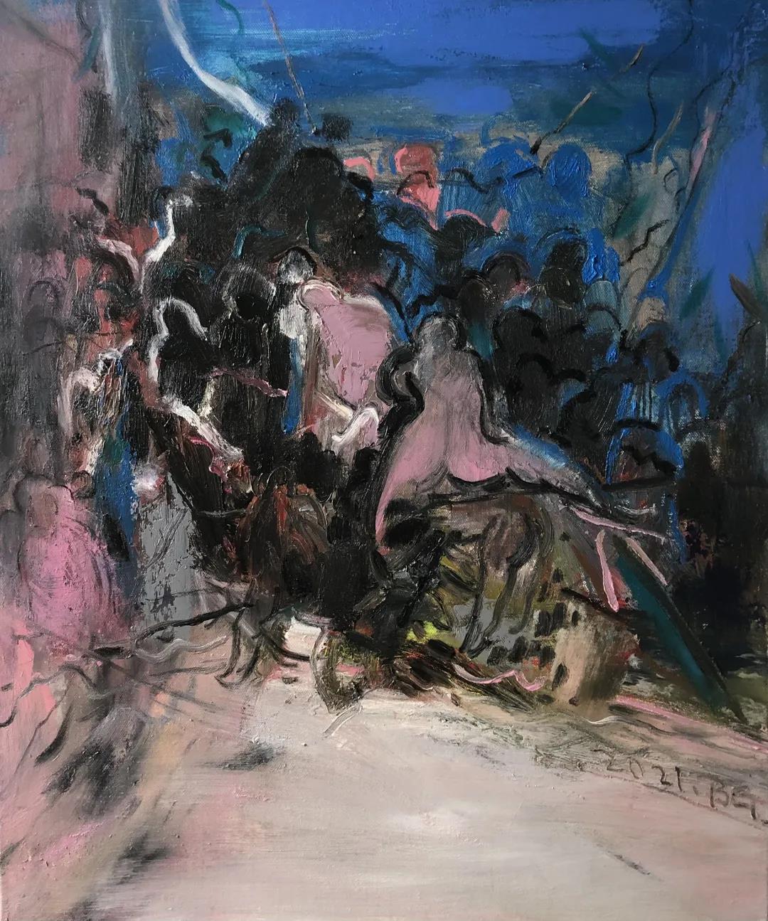 沒錯,斑駁破舊的漁船還在出海捕釣,港口夜晚的漁火依舊星星閃爍。人影憧憧,男女錯雜,時空疊加,意象繁復。說穿了,現(xiàn)實中根本不存在這樣的場景,這是虛構編造,是作者的胡思亂想??善婀至?,土著如我卻不由自主地被帶入,恍若白日夢,仿佛回到從前,又分明就是當前。能看到畫面散發(fā)的煙火氣,能感覺到人群的體溫,以及欣喜、興奮、平靜、惆悵、困惑的情緒傳遞。生命活力無法編造,莫非這都是“寫生”?藝術的主旋律永遠是離經叛道,不同于生活,有它自己的真實??此频牟淮嬖?,并不意味著不可能。只有對現(xiàn)實進行超越和重塑,才能滿足藝術家“說夢”的欲望。