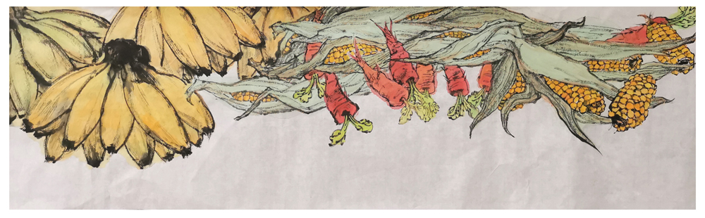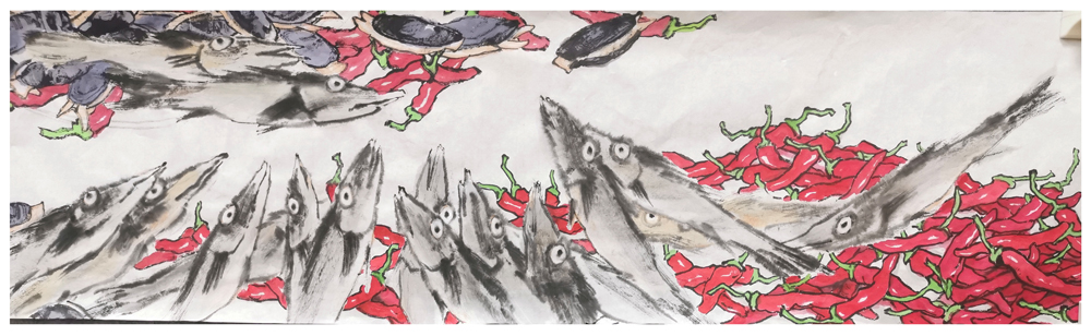 《菜市所見寫生》長(zhǎng)卷畫面中,海魚、熱帶水果、蔬菜、蔥姜,林林總總數(shù)十件,有聚有散,疏可走馬密不透風(fēng),構(gòu)圖一如最為樸實(shí)的鋪陳,不事雕琢,卻恰如渾然天成。造型兼工帶寫,草筆與工細(xì)并行,隨心勾染中實(shí)質(zhì)上是畫者筆力的駕輕就熟,以及常人難以企及的熟練所鑄就的瀟灑和率直。正因?yàn)榇?,生活中那些可能已?jīng)被人司空見慣的無(wú)生命靜物,卻在他筆下被調(diào)動(dòng)得生機(jī)盎然和靈性十足。數(shù)十上百物件,被點(diǎn)綴聚合在十?dāng)?shù)米的宣紙上,卻如電影大片全景中的人物,個(gè)個(gè)生命鮮活,開合有度,姿態(tài)各異,不繁雜,不多余,不對(duì)立,一切都恰如其分,這可能也正是柯毅這個(gè)無(wú)為而為導(dǎo)演的高妙之處。