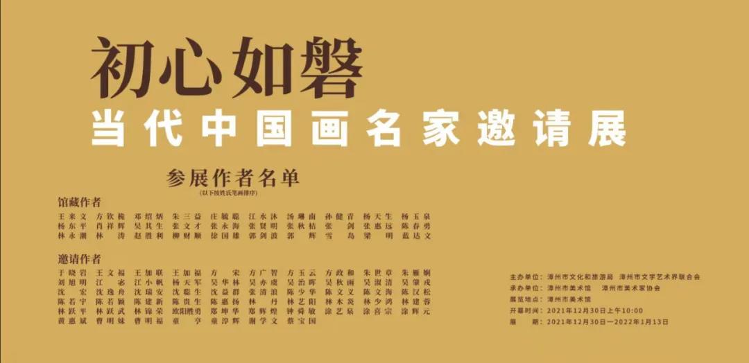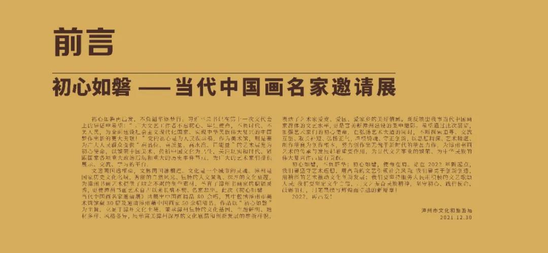文運(yùn)同國(guó)運(yùn)相牽,文脈同國(guó)脈相連。文化是一個(gè)城市的靈魂。漳州是國(guó)家歷史文化名城,秀麗的自然風(fēng)光、獨(dú)特的人文景觀、深厚的文化底蘊(yùn),為漳州書(shū)畫(huà)藝術(shù)提供了取之不竭的創(chuàng)作素材,孕育了漳州書(shū)畫(huà)家的聰穎靈秀,更使漳州書(shū)畫(huà)藝術(shù)自古以來(lái)長(zhǎng)盛不衰、名家輩出。此次《初心如磐——當(dāng)代中國(guó)畫(huà)名家邀請(qǐng)展》共展出中國(guó)畫(huà)精品80余幅,其中包括漳州市美術(shù)館館藏30幅及邀請(qǐng)漳州藉中國(guó)畫(huà)家50余幅精品。作品以“初心如磐”為主旨,立足于漳州文化土壤,秉承漳州獨(dú)特的文化基因,主題鮮明、題材多樣、風(fēng)格各異,展示富美漳州深厚的文化底蘊(yùn)和創(chuàng)新發(fā)展的嶄新樣貌,表達(dá)了藝術(shù)家愛(ài)黨、愛(ài)國(guó)、愛(ài)家鄉(xiāng)的美好情感。既反映出我市當(dāng)代中國(guó)畫(huà)家群體的文藝水平,更是富美新漳州建設(shè)的集中縮影。希望通過(guò)此次展覽,加強(qiáng)藝術(shù)家們的初心使命,在弘揚(yáng)藝術(shù)大道的同時(shí),不斷探索追尋、交流互鑒、取長(zhǎng)補(bǔ)短、弘揚(yáng)正氣,培根鑄魂、守正創(chuàng)新,以思想精深、藝術(shù)精湛、制作精良為創(chuàng)作根本,努力創(chuàng)作出無(wú)愧于新時(shí)代的精品力作,為漳州書(shū)畫(huà)藝術(shù)的傳承與發(fā)展起著重要作用,為當(dāng)代文藝事業(yè)的繁榮、為中華民族的偉大復(fù)興作出應(yīng)有貢獻(xiàn)。