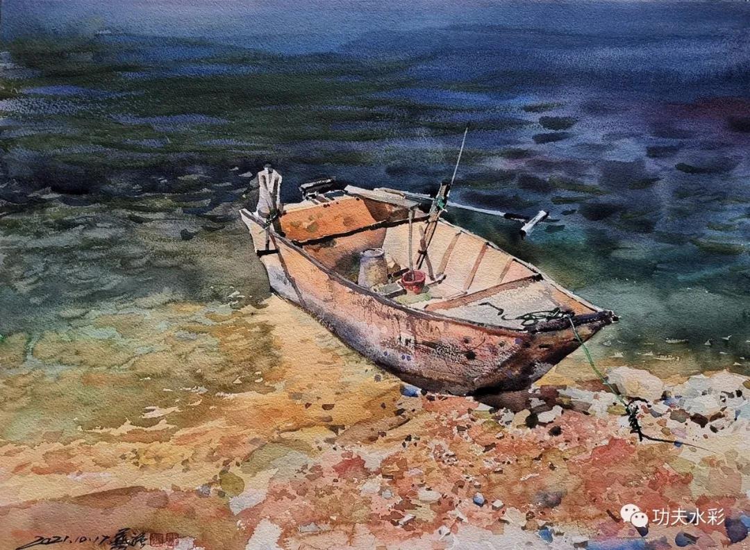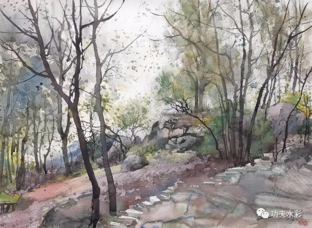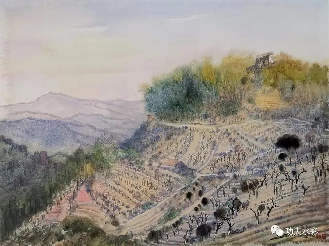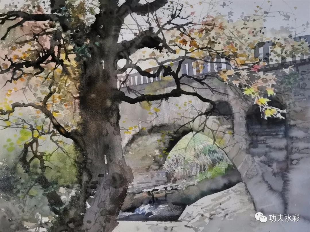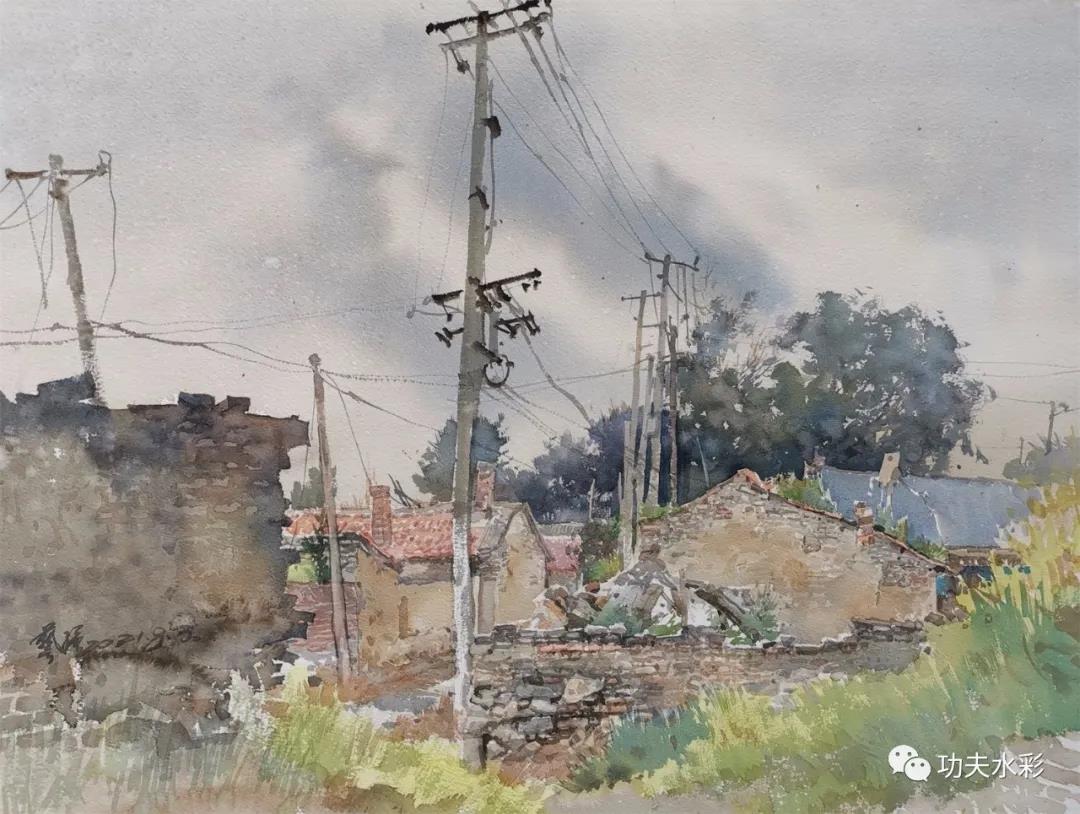 當然,能用思想駕馭畫題,是離不開“技術”層面的精研覃思的,他對水彩畫的技法進行了專業(yè)的、體系化的訓練與磨礪,所以畫法很嫻熟,非常精透。并且有意識地把中國畫的寫意技法轉遷給水彩畫創(chuàng)作,通過水對彩的和諧調兌,生發(fā)出了精彩的水彩寫意效果。妙在似與不似之間的風景塑造,很有惟妙惟肖的詩意。這里面駕馭水調于彩的法度秘籍,居有獨享獨成的可貴!如果不得法,水彩作寫意,肯定寫得一塌糊涂,這是水彩畫最不容易克服的困難,既是層層復沓之后的“濁蝕”感。