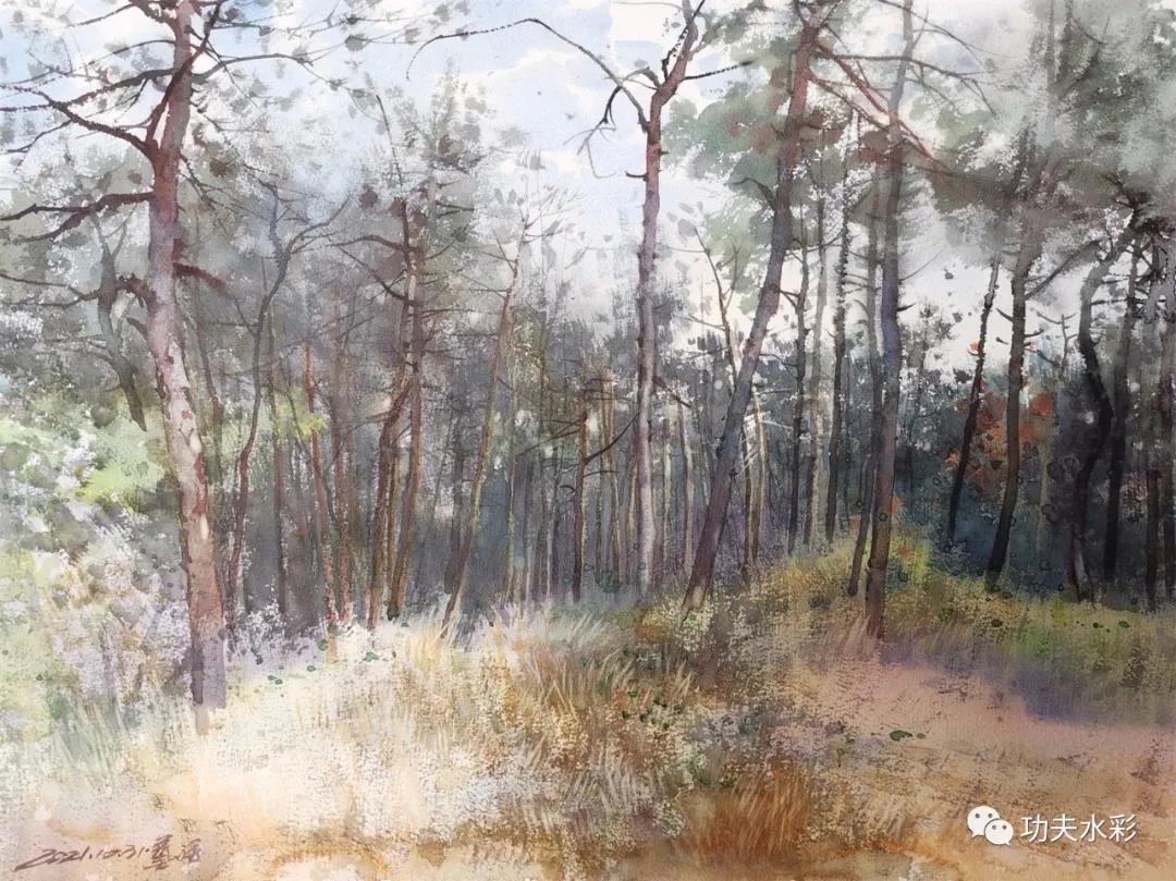 《松韻一一筆架山下的昕鑫生態(tài)農場松林》水彩畫 46x61cm