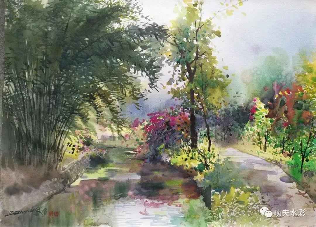 《外婆家田園小河一一蓬華華美村寫意》水彩畫 46x61cm