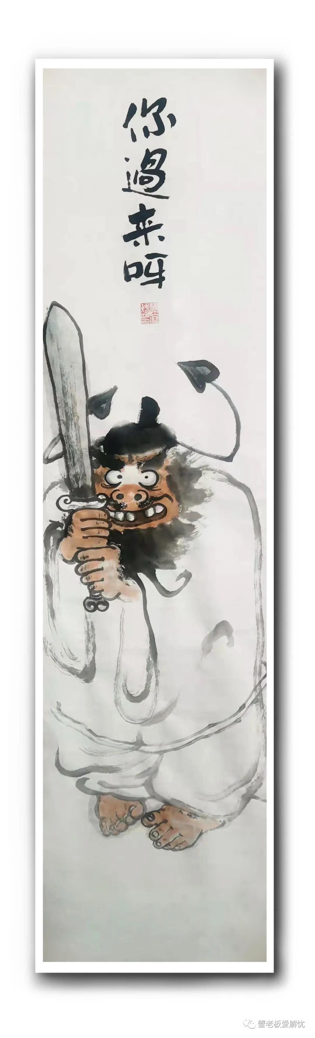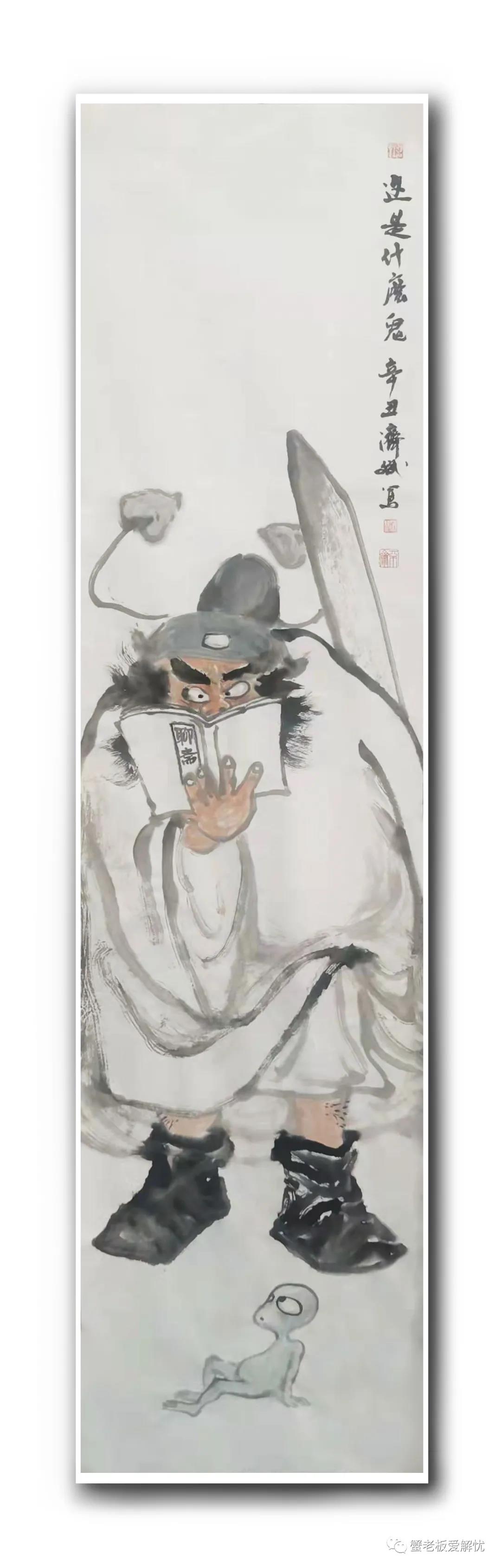 蟹老板卻希望,他筆下的鐘馗應該是一身正氣,除了能夠驅(qū)魔捉鬼以外,還是個詼諧幽默的充滿人間煙火味的大叔。于是就有了以下具有一定現(xiàn)實主義情懷的鐘馗系列。