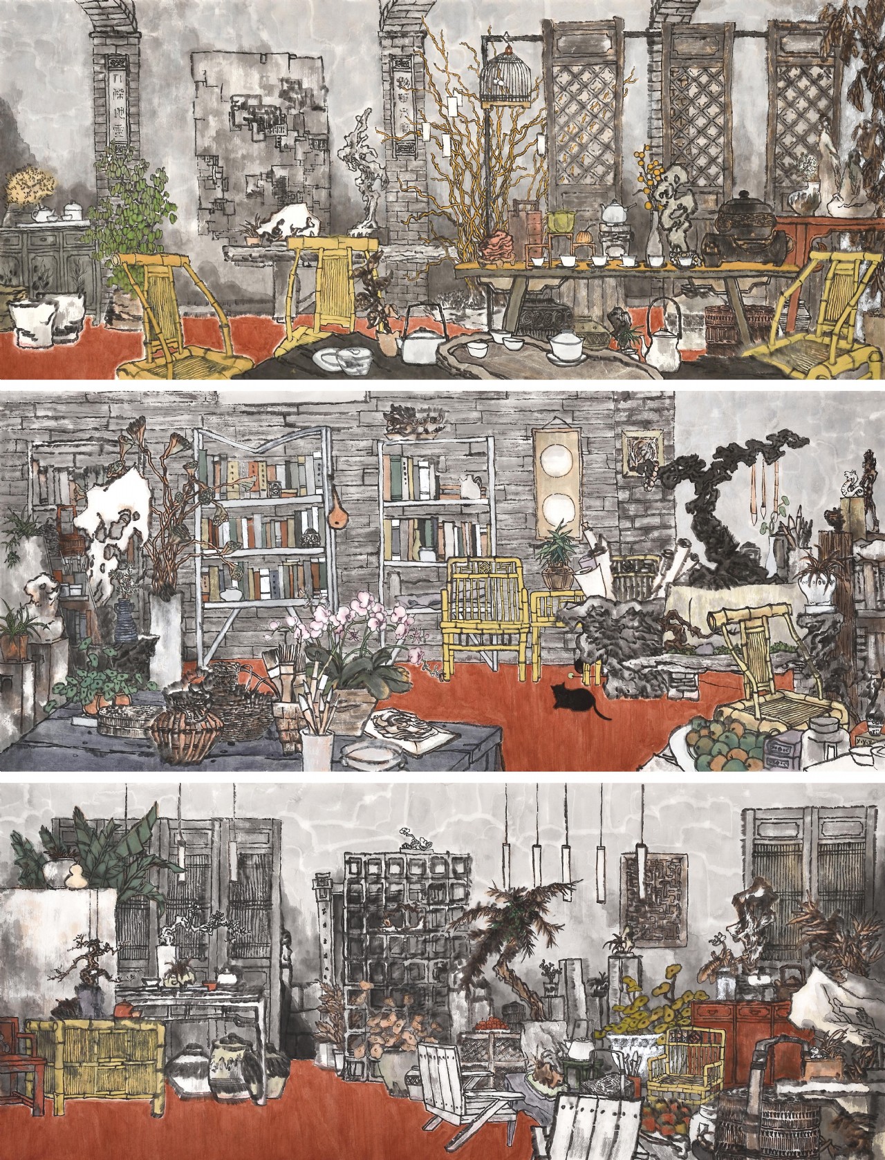 柯毅的繪畫創(chuàng)作以國畫為主,也有鋼筆淡彩與馬克筆水粉的作品。其國畫創(chuàng)作偏于寫意,但《淡淡的時光》《民藝品空間陳列印象》《歷久彌新》等一些作品卻有工筆的精細與繁復。