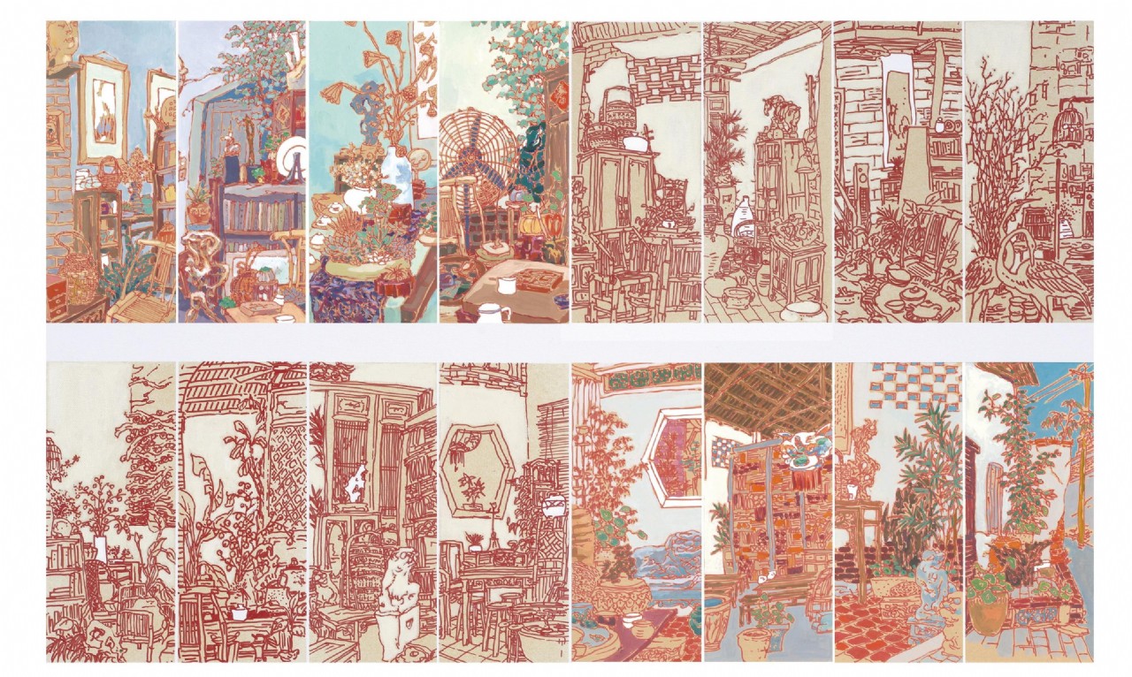 這些有關民藝品與陳列空間的畫作是我見過畫得最繁復的國畫作品了。整幅畫滿滿當當?shù)亩际俏?,而且是寫實的物。上面有竹藤椅、魚簍、鳥籠、閩南紅漆籃、花窗、克拉克瓷瓶、水缸、功夫茶具、石獅座、柜櫥、條案、屏風等。這些物自然不只是物。它們經(jīng)過時光的淘洗與人們的撫摸,積年的包漿散發(fā)著溫潤的光芒,更重要的是,它們是漳州人確認為自己是漳州人的典型物件,是老漳州人日常生活的承載。正因為如此,柯毅將其中的一組作品取名為《漫步時光》。