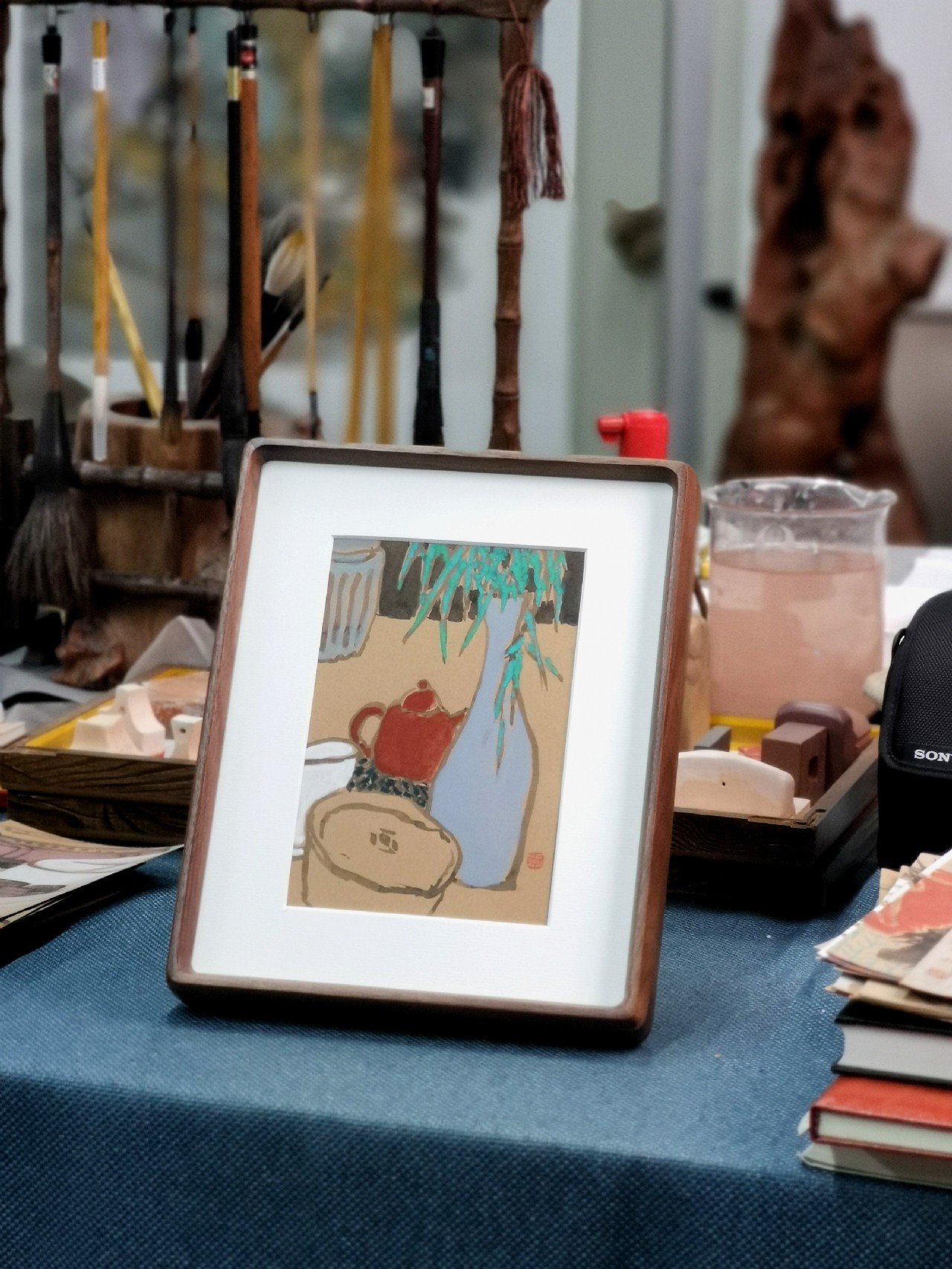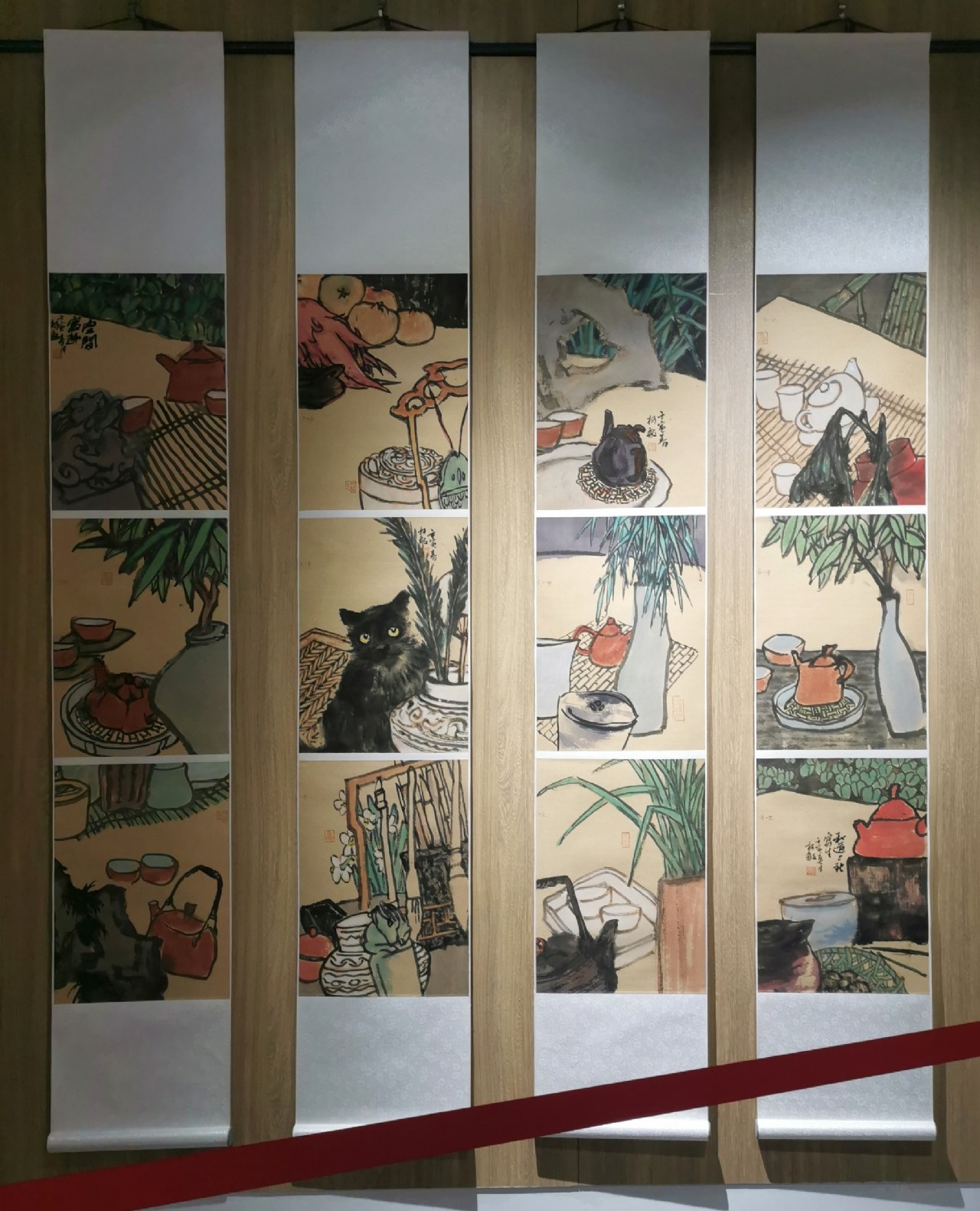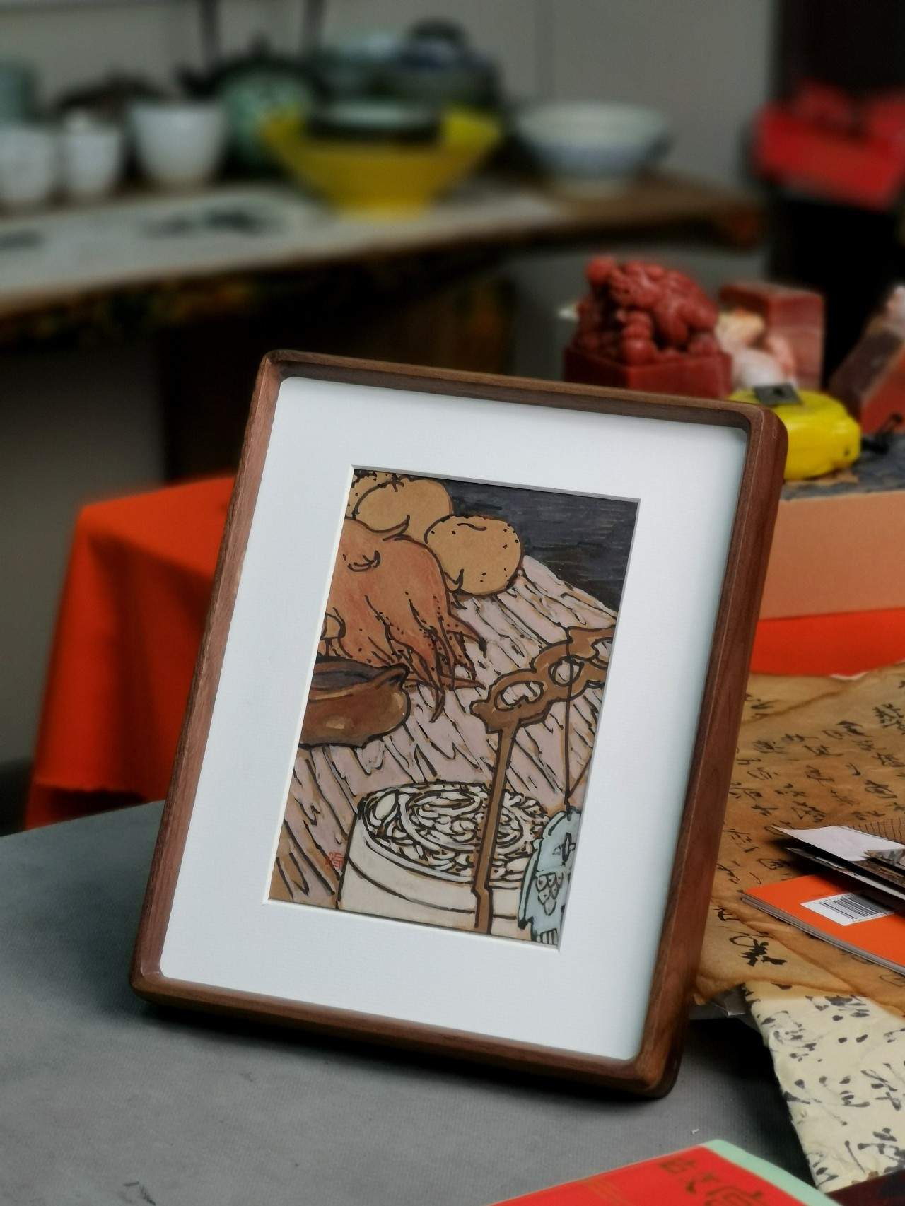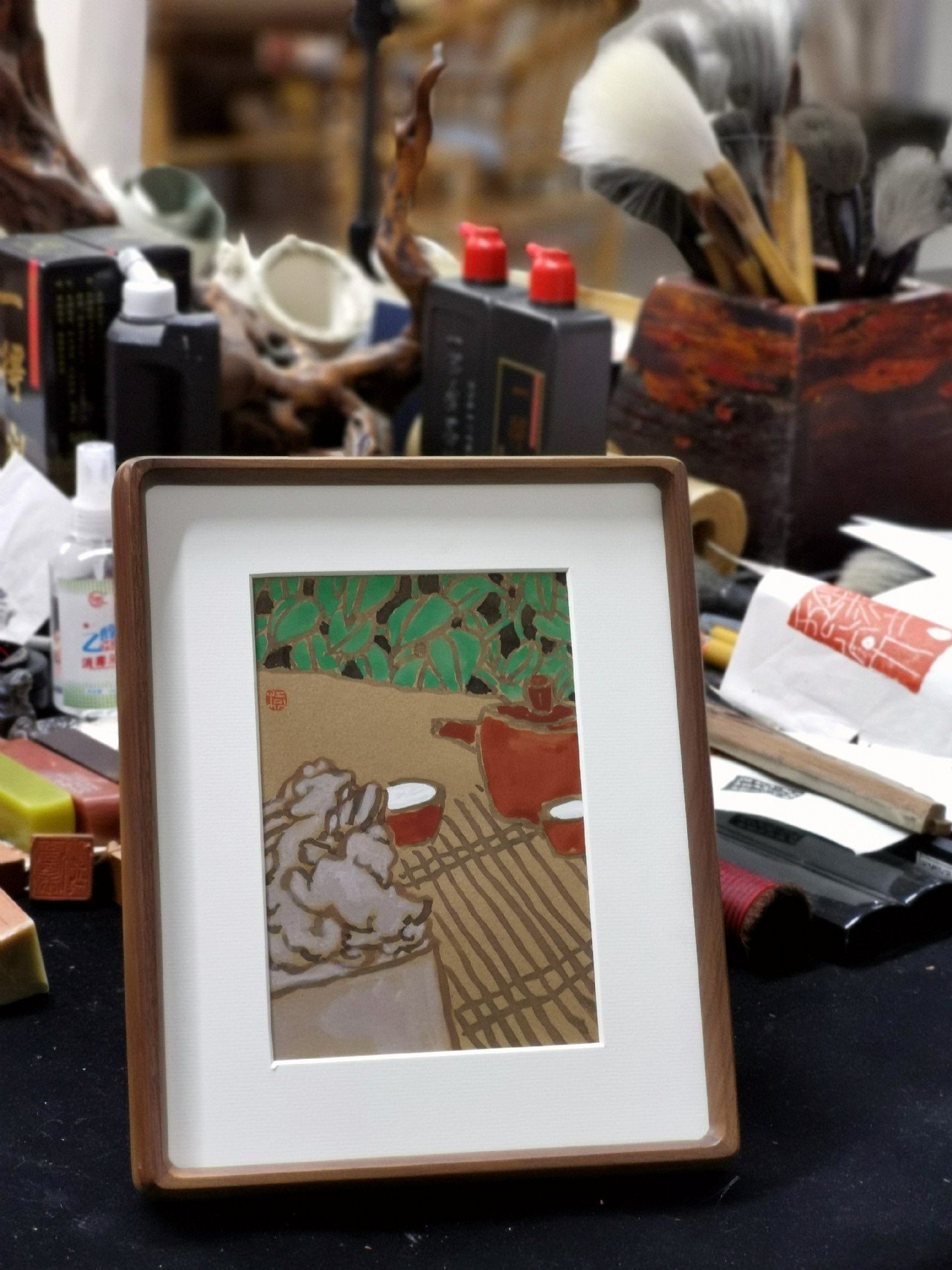 閩南之地,茶風(fēng)最盛,三五人的茶聚隨時(shí)隨處可見(jiàn)。和道工社的茶會(huì)亦是不少,新舊物件也算是多的了。行走其間,茶席、文房用具、竹椅、綠植還有蹦蹦跳跳的小黑貓墨汁,這些場(chǎng)景和物件,自然是可以直接入畫(huà)的。興致一起,畫(huà)數(shù)量和內(nèi)容就多了。這些小畫(huà)比起古人的博古圖,雖然少一份文人畫(huà)的清雅,但多了一份真實(shí)和有趣。