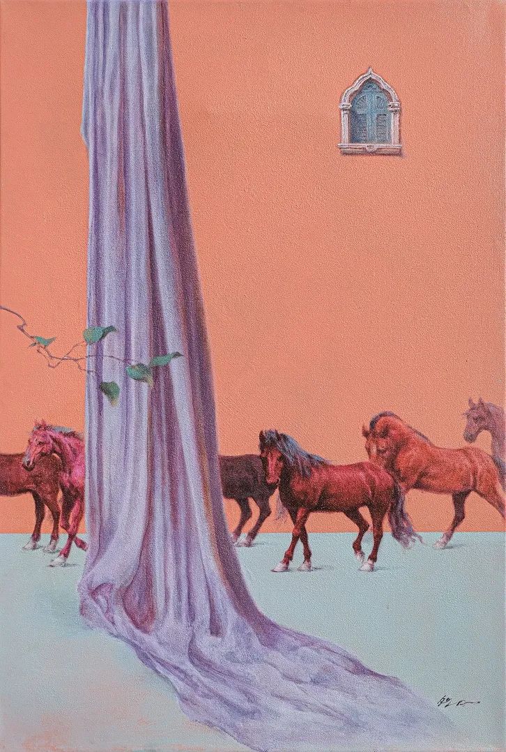 譚軼瑋的作品一直在表達(dá)“希望”,畫面中的人物、飛魚、馬、鹿、鶴、云彩、世外桃源般愜意安適的地方,無一不是在向觀者訴說著對美好生活的向往。
