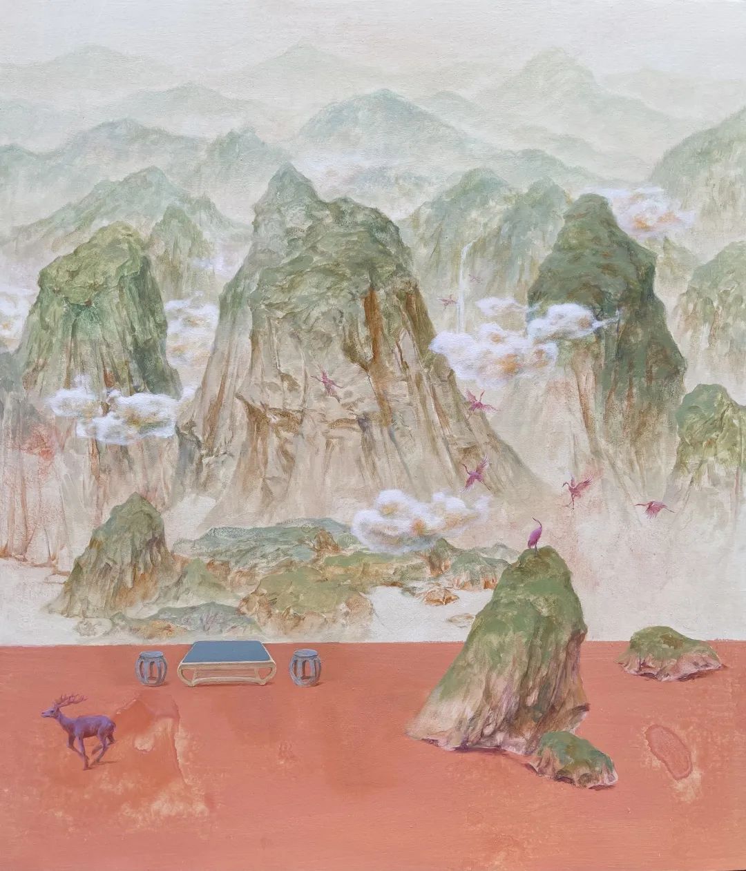 嵯峨黛綠的群山,滿山蓊郁蔭翳的樹木與遼闊的天空,幾縷云縹緲在其間,仙鶴山間翱翔,麋鹿在歡快跳躍,畫面中一桌倆凳,好似仙人品茗對弈,或是一對傾心戀人享受這人間仙境,又或三五好友在那熱烈交談。