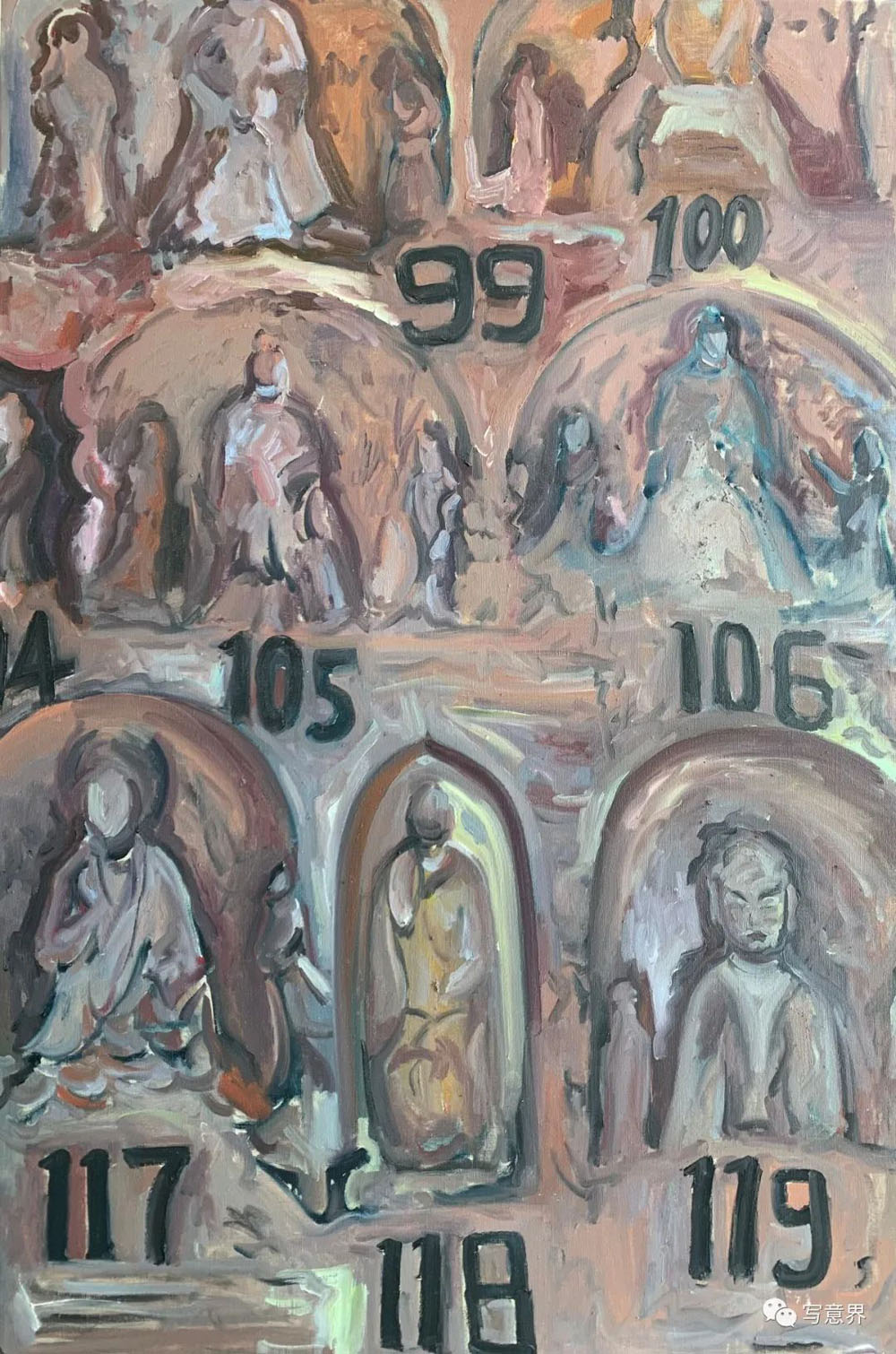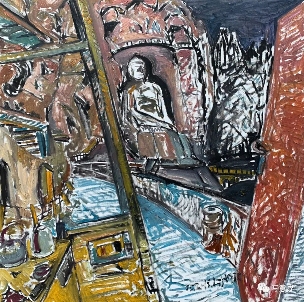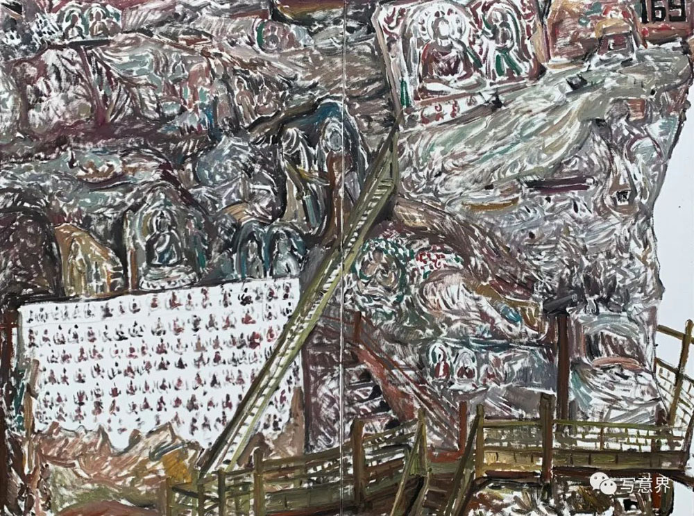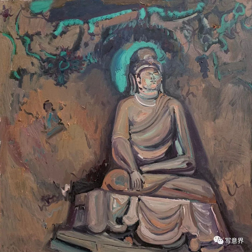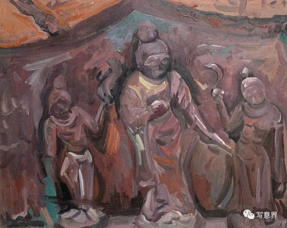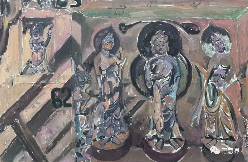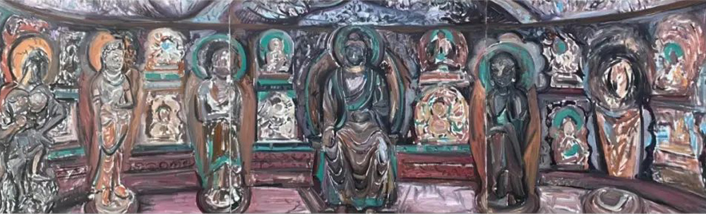僅僅半年,他的油畫石窟造像系列成果著實讓我吃驚不少,不僅作品數(shù)量多、畫幅大,而且這些作品已經(jīng)初顯出自己新的面貌,經(jīng)過多次深入炳靈寺各石窟現(xiàn)場寫生,石窟、造像、壁畫等造型符號融入了作品整體的隊列之中。可貴的是小何的作品沒有步入當(dāng)下寫生流行的套路,他并未僅僅將眼前這些文明古遺作為寫生的對象,拘泥于具體對象形色如實的呈現(xiàn),而是努力去尋找與遠(yuǎn)古文明的對話,探尋思量石窟與巖崖布局的關(guān)系,造像與壁畫的造型特征,歲月與自然沉淀的歷史留痕等等,這些視覺表層與文化內(nèi)核交織在一起,為他的創(chuàng)作提供了多種可能。小何的寫生,更多是現(xiàn)場的實地創(chuàng)作,選擇在古代遺跡的現(xiàn)場與安靜在畫室提筆是迥然不同的,這種現(xiàn)場的在地性會促發(fā)激情,激發(fā)靈感,超越慣性,產(chǎn)生創(chuàng)造。在現(xiàn)場創(chuàng)作的作品無疑是充滿激情與想像的,有張力的線條支撐著畫面的構(gòu)架,望其畫面,古代壁畫的線條律動,有意無意的筆觸留白,有如匠工造像的斧痕鑿跡,色層堆積中有巖彩粗獷的肌理都得以映入眼中。