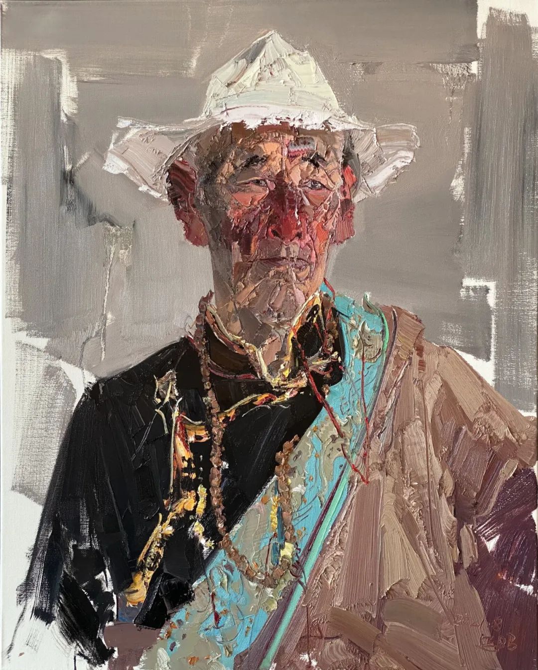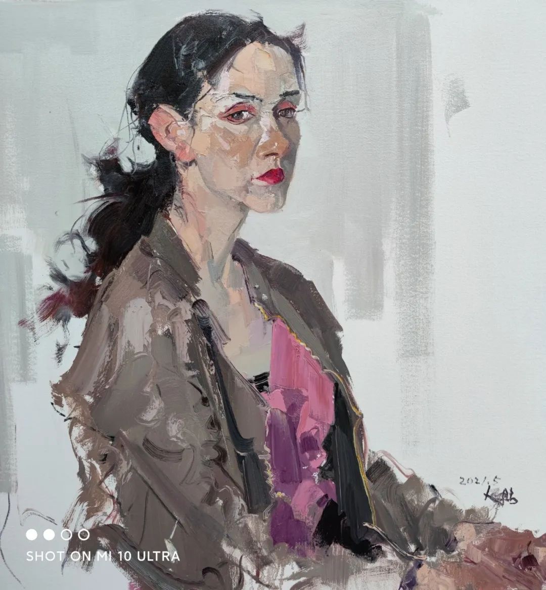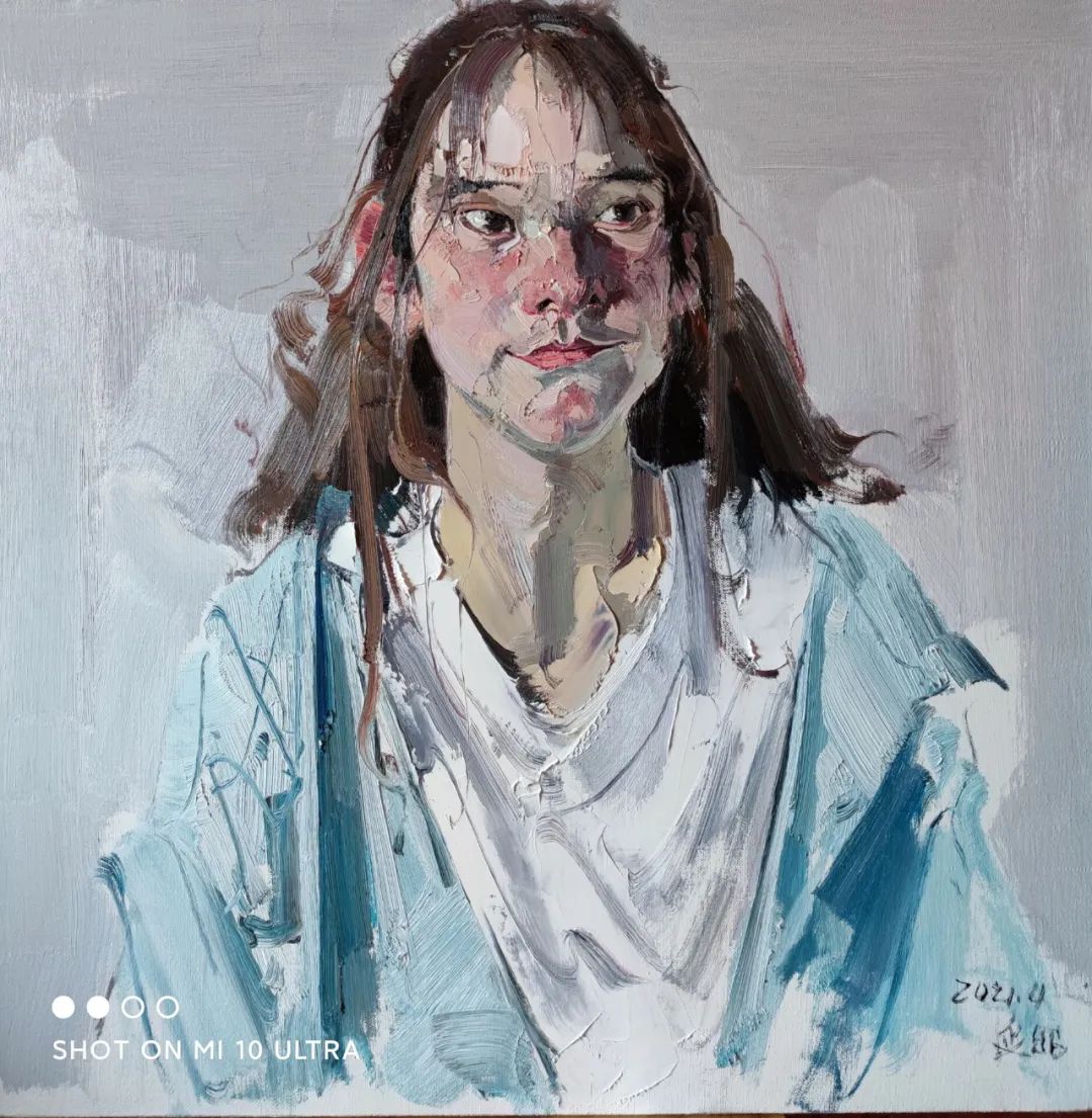 如果說屢次參加全國美展、全軍美展的革命歷史題材作品如《人民的力量》、《八女投江》、《抗日》等是張延昭人物畫中的扛鼎之作,那么大量的人物畫、肖像畫也是不可忽視的部分。如在對新疆少數(shù)民族肖像畫的創(chuàng)作中,張延昭常常采用概括的手法去塑造人物形象,注重以形寫神,講究運筆的韻味而不拘泥于細節(jié)的真實。如在對人物服飾的處理上,常常是大筆觸一帶而過,而不注重輪廓邊緣線是否清晰。他常常采用中國畫中留白的手段,以期達到筆未到而意已到的藝術(shù)審美效果。在他的作品中,色彩、明暗、筆觸、空間無形之中都服從于中國畫中“氣韻生動”這一審美意蘊。在此,油畫本體語言的運用和中國寫意精神的表達,無一不體現(xiàn)出張延昭深厚的繪畫功底和藝術(shù)學(xué)養(yǎng),讓欣賞者從平和沉靜的描繪中體會生命存在的深意,捕捉生命中的感動,寄予自己深刻的文化關(guān)懷。