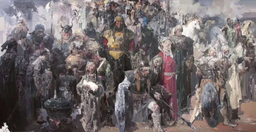 然而,夢想和情懷往往需要強大的精神來支撐。好在,“世界上只有一種英雄主義,就是認清了生活的本質(zhì)下,依舊熱愛生活”(羅曼羅蘭)。從這樣的角度來說,置身于精神荒蕪的物質(zhì)社會里,以北方人的豪爽性情,本著一種改變命運,渴望成功的雄心,以“草根”的身份,毅然踏足繪畫領(lǐng)域,以藝術(shù)的方式觀照自然萬物,與天地接引,并且能夠永久保持不厭不倦的精神進行苦行僧似的探索與實踐,在舉手投足間,張延昭散發(fā)的自然全是光芒與力量。而憑借幾十載的努力與堅持,在徐悲鴻、羅工柳、董希文、林風(fēng)眠、靳尚誼、詹建俊等前人走過的路徑上,在不斷推翻、又不斷修正的過程中,執(zhí)著地掙脫理法、程式、論調(diào)、表相的束縛和羈絆,走出一條具有中國精神和中國氣派的寫意性油畫之路,展現(xiàn)出自己特有的審美訴求、藝術(shù)風(fēng)格和凌厲的繪畫樣式,不僅僅是對自我靈魂的一種呼應(yīng),更是張延昭對當代中國寫意油畫圖式的創(chuàng)新和審美拓展的貢獻所在,同時也是在本土美術(shù)的現(xiàn)代性與移植美術(shù)的本土化進程中獲得民族文化的深層回歸與橫向跨越。