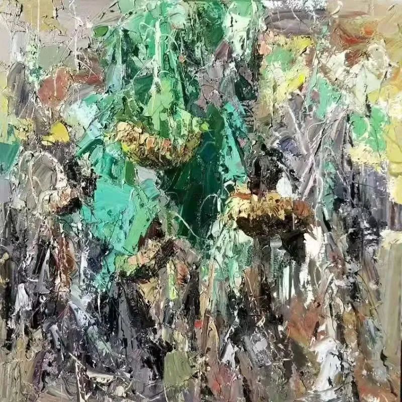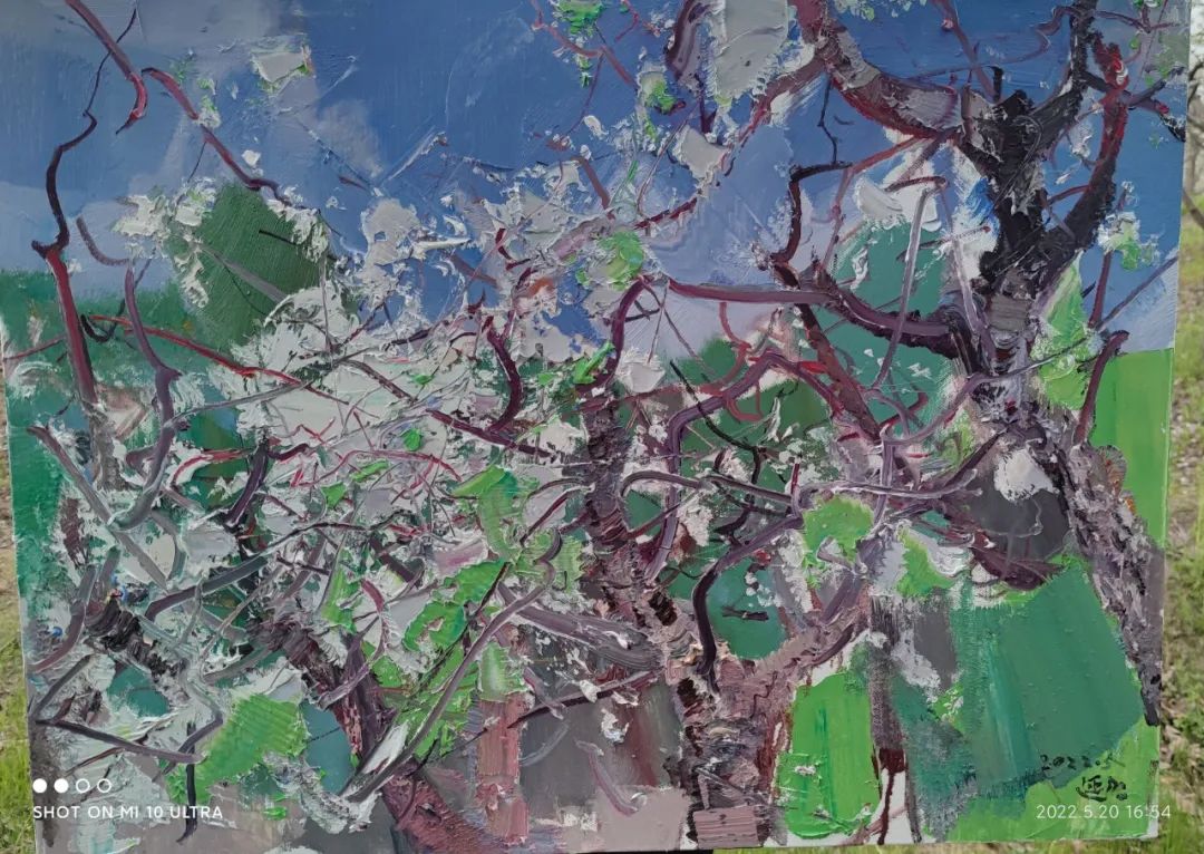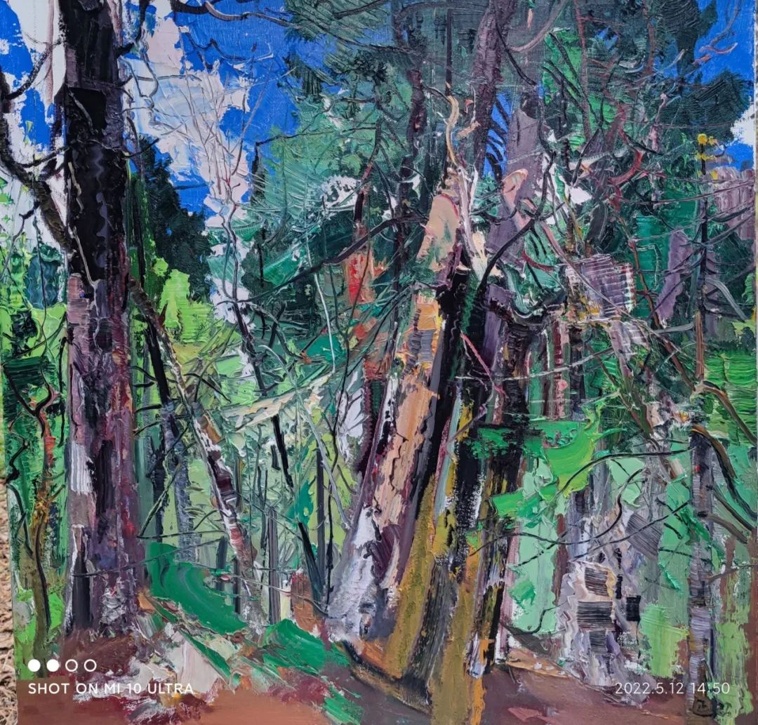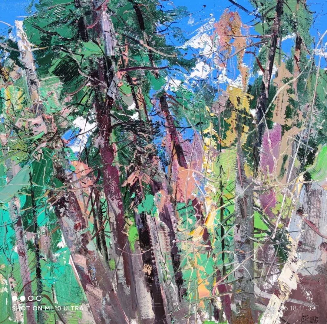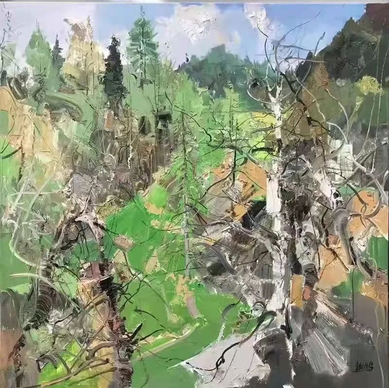 張延昭筆下的的風(fēng)景畫作品,以情感為基石,他把對大自然無盡的愛以飽滿的創(chuàng)作激情付諸于筆端,在表達自己內(nèi)心世界真心感受的同時,表現(xiàn)出大千世界驚心動魄的美。也許同是漂泊在外的黑龍江人的緣故,對張延昭描繪家鄉(xiāng)景色的《鶴崗風(fēng)景寫生》和《帽兒山風(fēng)景寫生》系列作品,特別是對以描繪林木為主題的作品尤為鐘愛。這些作品不僅構(gòu)圖優(yōu)美,而且色彩清新、絢麗,冷暖對比強烈。近乎平面化的天空,或灰得深沉憂郁,或藍得忘乎所以。在他自由奔放的筆觸下,時而是對顏色強有力的堆積,時而又輕輕掠過畫布的底色,有時又以刮刀作畫,或刮或抹,縱橫開合,制造出特殊的肌理效果,使畫面極具張力與美感。在這些作品中,我們可以清楚的看到很多表現(xiàn)因素,比如,有時他會采用補色的方法,以達到視覺平衡狀態(tài),讓畫面局部色澤更為鮮亮,使畫面效果更加和諧。再比如在畫面的處理上,他常常會以飛舞靈動的線條將畫面重新割裂又重新組合,不但增加了繪畫元素,也使畫面內(nèi)容更加豐富。而線條粗與細的對比,大塊面與小線條的對比,讓畫面愈加生動、鮮活,極具唯美浪漫主義傾向。