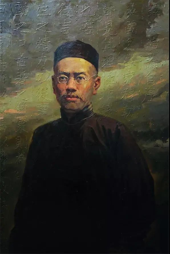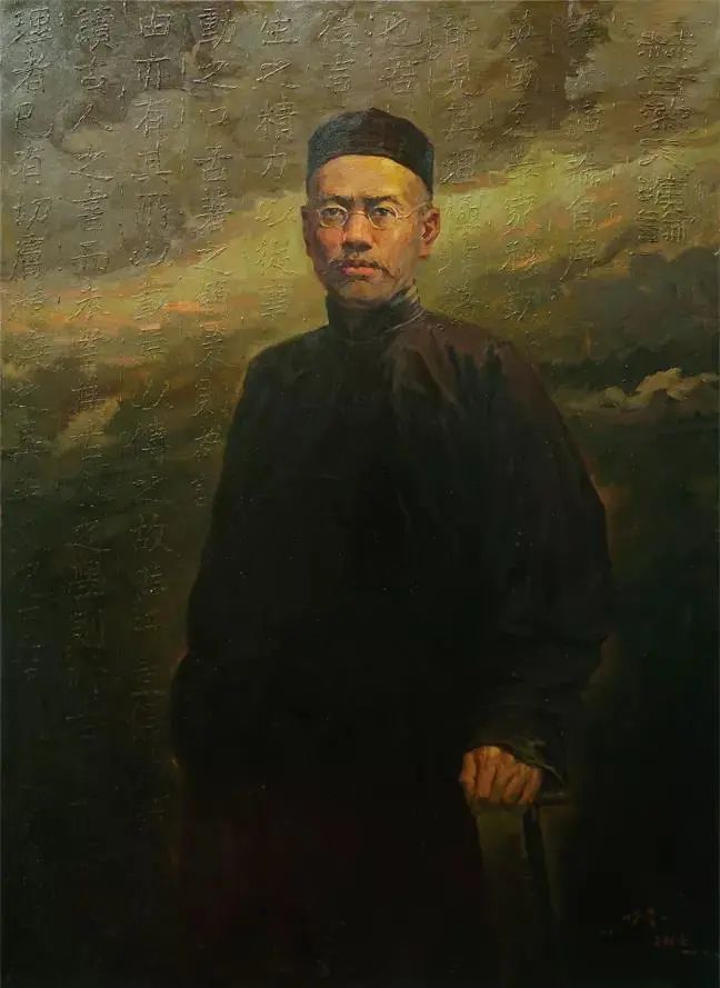 作品《嚴(yán)復(fù)》通過(guò)藝術(shù)的視覺(jué)語(yǔ)言描繪我國(guó)近現(xiàn)代著名思想家、教育家、翻譯家嚴(yán)復(fù)先生。他是中國(guó)現(xiàn)代哲學(xué)、經(jīng)濟(jì)學(xué)、社會(huì)學(xué)、法學(xué)、邏輯學(xué)、翻譯學(xué)的開(kāi)拓者和先驅(qū)。作品表現(xiàn)嚴(yán)復(fù)先生作為杰出的中西文化傳播者博大精深、學(xué)貫中西的思想學(xué)識(shí)與開(kāi)放進(jìn)取、兼容并蓄的精神境界和深厚的民族情懷。作品以肖像刻畫(huà)為主,著重表現(xiàn)嚴(yán)復(fù)先生堅(jiān)毅、智慧的改革思想和勇于追求科學(xué)與真理的精神。人物動(dòng)態(tài)微微后仰,表現(xiàn)嚴(yán)復(fù)放眼世界的胸懷,眉間緊縮,透露出“憂國(guó)憂民”的偉大民族情懷。作品背景風(fēng)起云涌,象征革命時(shí)代前夕的激流涌動(dòng)、變幻莫測(cè),云間透出的霞光映在嚴(yán)復(fù)臉上象征希望、理想與信念。作品背景隱隱約約透出嚴(yán)復(fù)的代表譯作---《天演論》。畫(huà)家利用厚堆材料的繪畫(huà)語(yǔ)言對(duì)文字進(jìn)行塑形,文字內(nèi)容以一種淺浮雕的獨(dú)特視覺(jué)效果給予呈現(xiàn),暗示著嚴(yán)復(fù)先生學(xué)貫中西的偉大貢獻(xiàn)。作品以巨匠的直立肖像典型動(dòng)作為畫(huà)面主體,注重肖像畫(huà)創(chuàng)作的歷史意義和價(jià)值。作品色調(diào)統(tǒng)一,色調(diào)冷灰?guī)?,樸素莊嚴(yán),冷暖互補(bǔ),給人以歷史的厚重記憶與懷念之意境。作品強(qiáng)調(diào)黑灰白的關(guān)系,用筆上講究繪畫(huà)的平面感與光線的主觀結(jié)合,充分發(fā)揮油畫(huà)的神秘而真實(shí)的繪畫(huà)語(yǔ)言。
