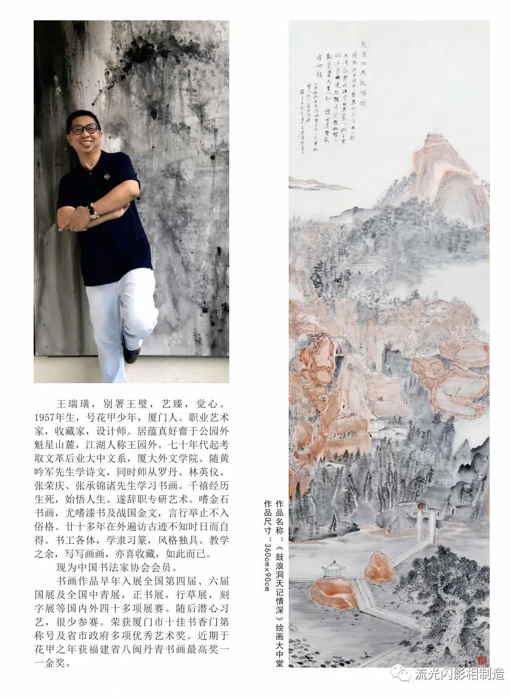 王璧書畫創(chuàng)作力極其旺盛,近十幾年,幾乎每年都有作品集問世,不同主題、形式的展覽有序進行和推進,年逾花甲而成績頗豐,絲毫不遜年少輕狂之輩。比如,十分恬靜地書寫人們耳熟能詳?shù)摹兜赖陆?jīng)》、《千字文》、《離騷經(jīng)》等等古今名品,選擇各種書體加以表現(xiàn),尤其是榮獲福建省書畫"八閩丹青"金獎的《晝錦堂記》,書體中以漢碑清隸巧妙溶合又不失當(dāng)代隸書新面目,更是王璧隸書風(fēng)格的一次展現(xiàn),得到書壇許多專家的認可。