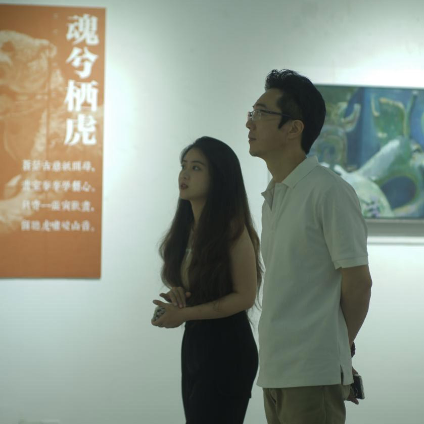 開幕式由廈門大學(xué)藝術(shù)學(xué)院美術(shù)系楊寒松教授主持,張立平教授與油畫教研室林曦副教授對邱俊熔的藝術(shù)作品給予了充分肯定,楊老師鼓勵同學(xué)們藝術(shù)創(chuàng)作要大膽嘗試,用勤奮彌補(bǔ)自身不足,不斷創(chuàng)新和突破自己。邱俊熔同學(xué)的作品整體就像重金屬搖滾,她將具有中國油畫之稱的大漆運(yùn)用在綜合材料創(chuàng)作中,她一方面通過運(yùn)用古代的器物造型例如虎元素,青銅,為造型以此作為題材,另一方面將大漆運(yùn)用在油畫創(chuàng)作當(dāng)中??偹苤笃崾侵袊陚鹘y(tǒng)藝術(shù),油畫與大漆結(jié)合此類探索尚不多,現(xiàn)在處于探索階段,雖然還有不足,尚可有所探索的余地。