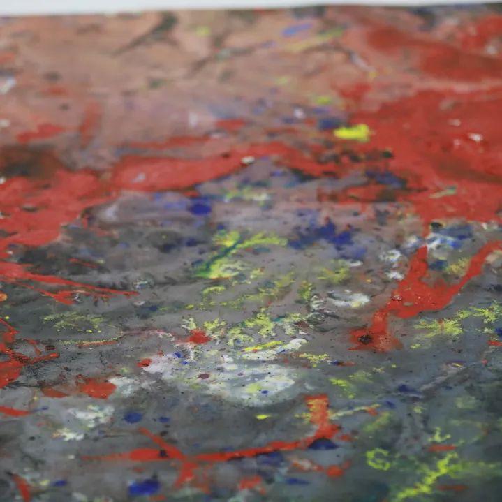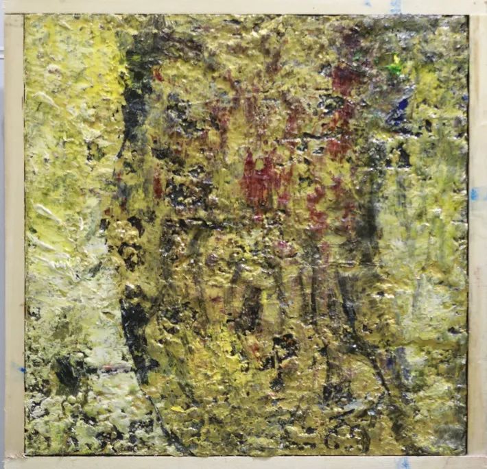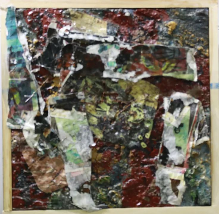 魏新的作品色彩炫重,形散意在,個(gè)性鮮明。此次展出的綜合材料作品,使用了無機(jī)礦物質(zhì)顏料,巧妙運(yùn)用報(bào)紙、畫報(bào)、鐵線、陶瓷片等材料媒介通過剪切、拼貼等方式來制作而成,色彩的神奇變化使情感宣泄更加具象,畫家個(gè)人的視覺和觀念更具外化。整幅畫作抽象立體,具有很強(qiáng)的視覺沖擊力。