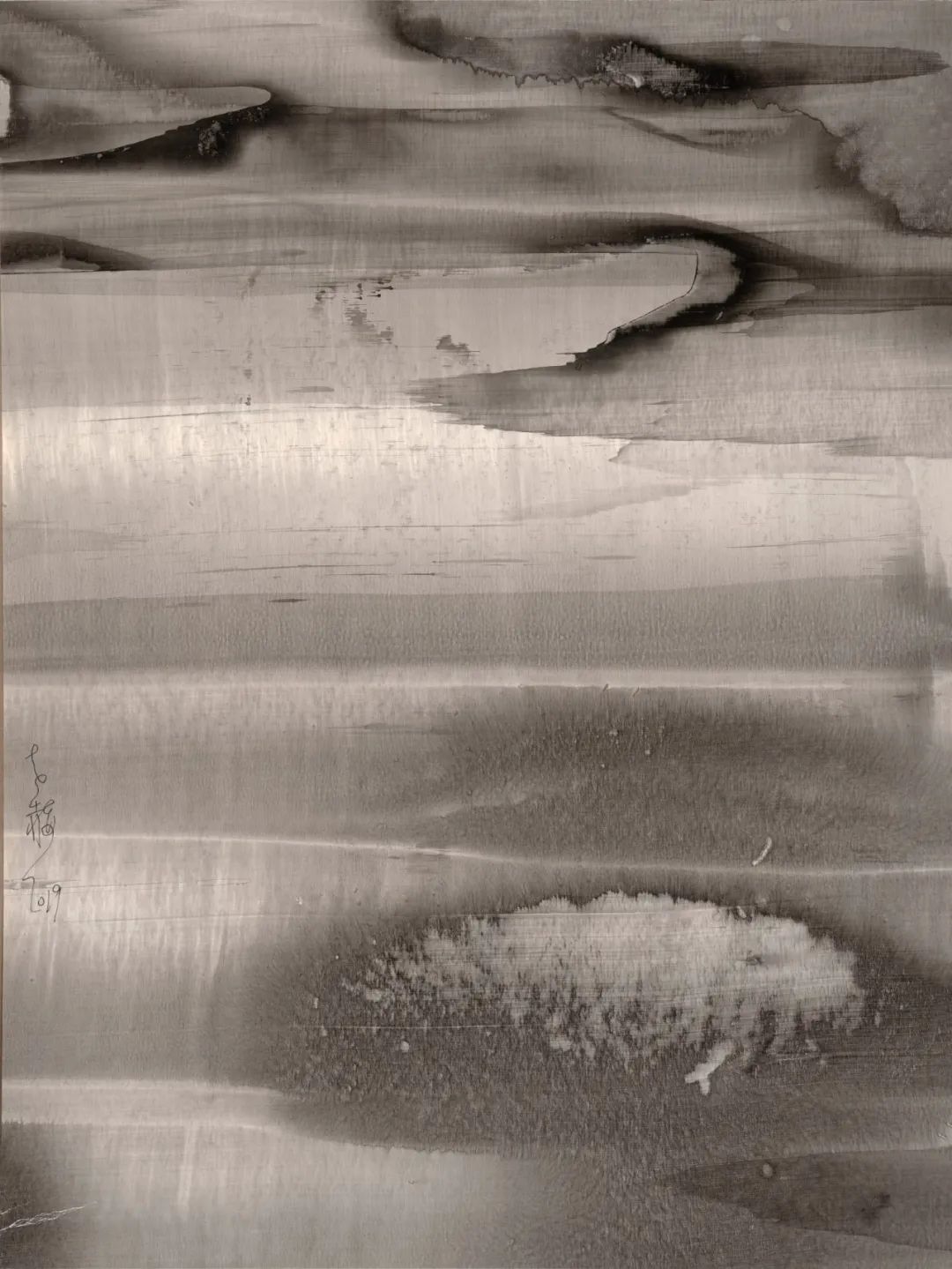 還有一個(gè),我覺得和工具、材料的關(guān)系很大。比方說給你一個(gè)毛筆,一個(gè)長鋒或者是一個(gè)排筆,畫出的、涂出來的感覺是不一樣的,硬質(zhì)和軟質(zhì)的工具,不同厚薄能一樣嗎?加上不同的速度、輕重使其在呈現(xiàn)上多了一些異樣趣味。