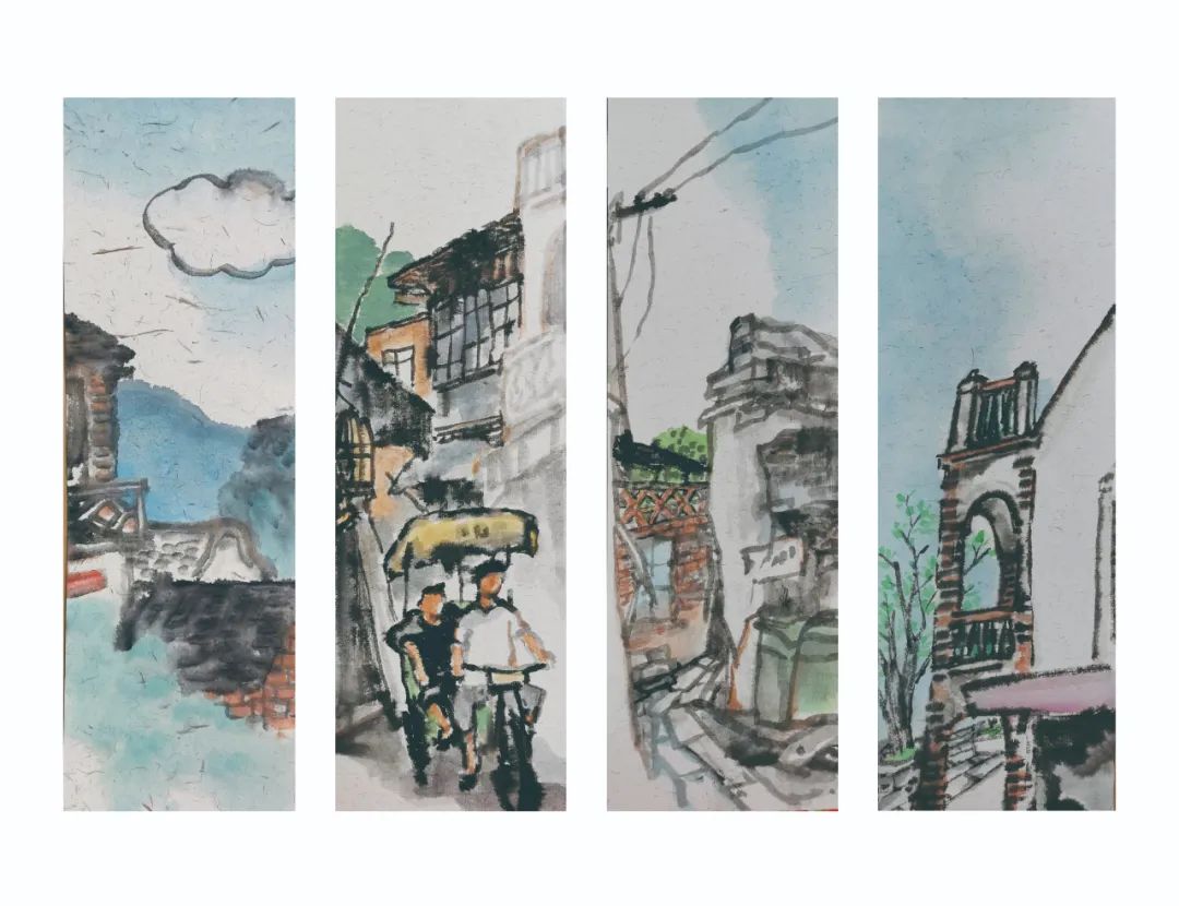 《漳州古城》系列大部分視角是老漳州人日常出行的場(chǎng)景,石板路的街里各式閩南老建筑高低錯(cuò)落。當(dāng)我看到這組古城國(guó)畫的畫面,直覺(jué)是一種恬靜,淡然的感覺(jué)躍然紙上。歲月的時(shí)光機(jī),已經(jīng)把當(dāng)年的“柯大俠”沉淀為現(xiàn)在的“柯老師”。經(jīng)歷過(guò)少年調(diào)皮、青年不羈,再到工作三十余年后對(duì)事物觀察細(xì)致入微的生活歷練,柯老師筆下的古城,畫風(fēng)鮮活通靈,人物街景栩栩如生。雖然細(xì)節(jié)經(jīng)過(guò)了藝術(shù)處理,不會(huì)讓人一眼看出畫中的景象細(xì)節(jié),但這樣的畫面,對(duì)于我這個(gè)外鄉(xiāng)人來(lái)說(shuō),能瞬間感受到閩南小城的歲月靜好,體驗(yàn)到閩南人雖在勞作卻也放松的平衡心態(tài),也就不難理解閩南原鄉(xiāng)人對(duì)家鄉(xiāng)的情懷是:生于茲、長(zhǎng)于茲、念于茲、安于茲。