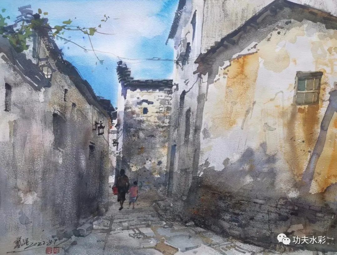 《小巷之遇一一婺源思溪延村故事之七》水彩畫 61x46cm