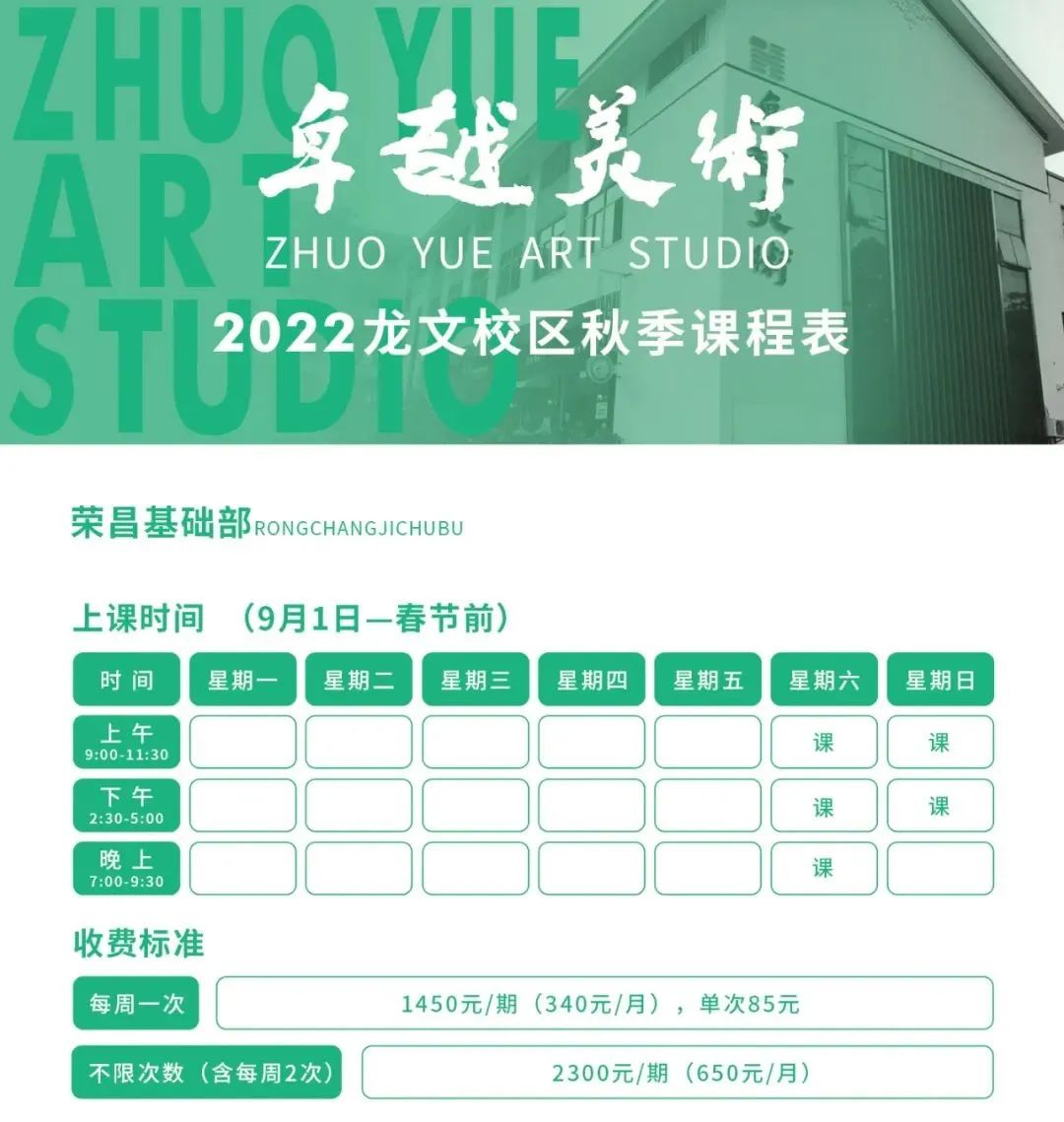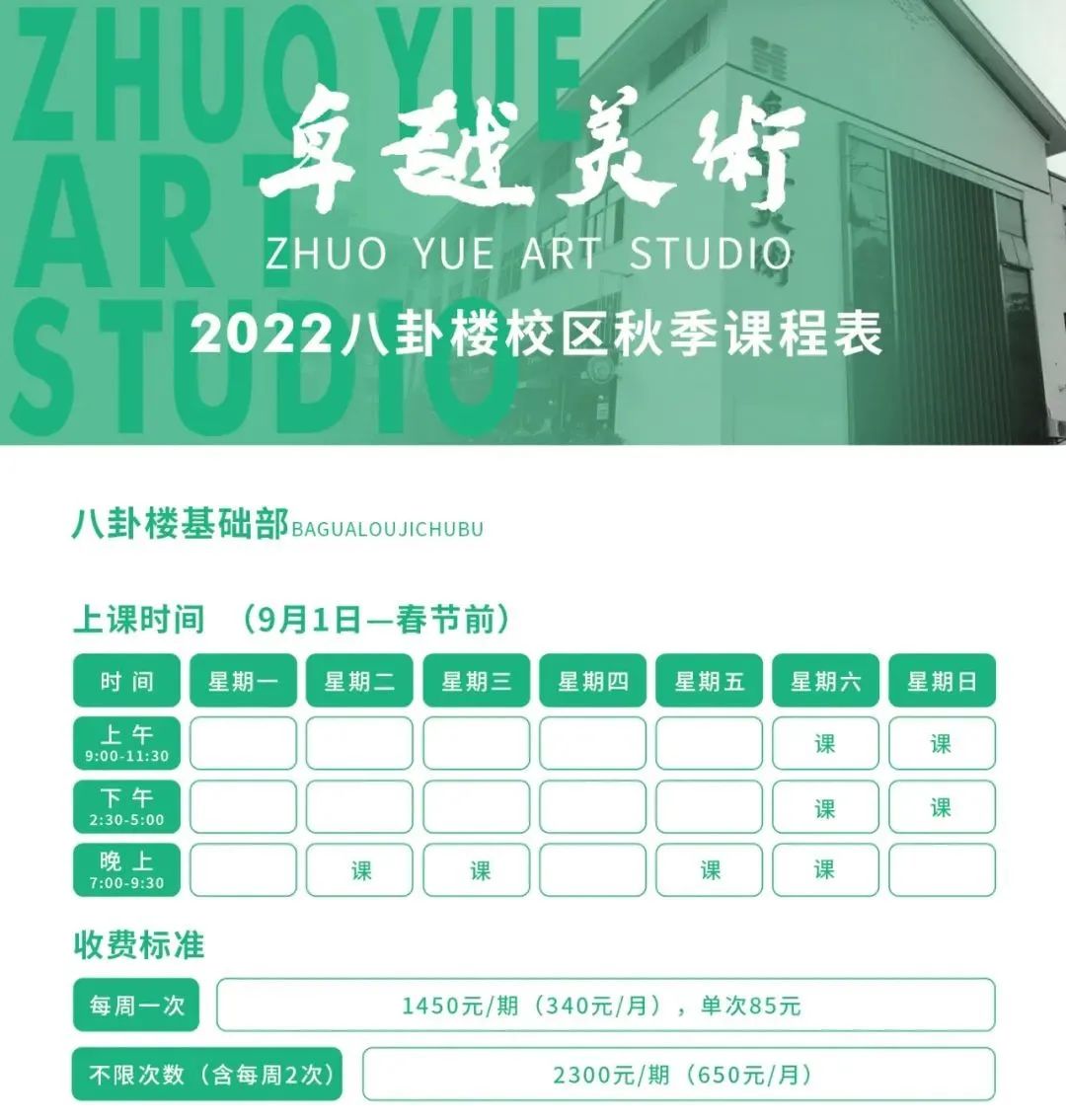 總部(八卦樓校區(qū))和龍文校區(qū)(榮昌花園)分別有基礎(chǔ)部和少兒部,八卦樓校區(qū)位于省級(jí)文化產(chǎn)業(yè)示范基地---八卦樓文化城,教學(xué)面積800多平米,龍文校區(qū)位于榮昌花園晨暉大廈,商業(yè)地段,教學(xué)面積近千平米,分層次,分學(xué)科,因材施教,系統(tǒng)規(guī)范。卓越畫室還擁有龍巖校區(qū)、金峰校區(qū)、長(zhǎng)泰校區(qū)等,方便學(xué)生就近學(xué)習(xí),為當(dāng)?shù)靥峁﹥?yōu)質(zhì)學(xué)習(xí)平臺(tái)。