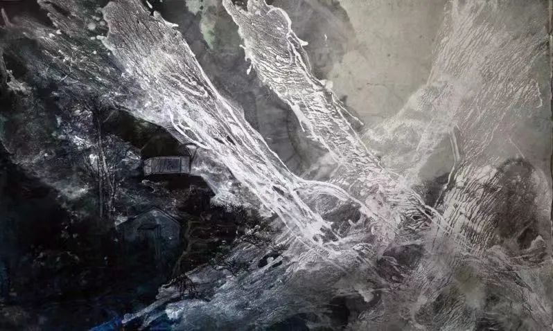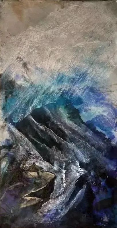 若隱若現(xiàn)若存若亡,常??偸窃谖赐耆陌氤善飞峡吹缴降奈《肱c村落的炊煙,于是情不自禁“按圖索驥”,推理演繹,從小的書法童子功,師院養(yǎng)成的速寫習(xí)慣,中央美院訓(xùn)練的全因素素描,于不經(jīng)意間完成了一次次新的“心靈的漫步”,早年當(dāng)兵在海邊漁村、山寨、島礁危巖、淺灘沙渚形之于筆端,謂之《山居系列》。