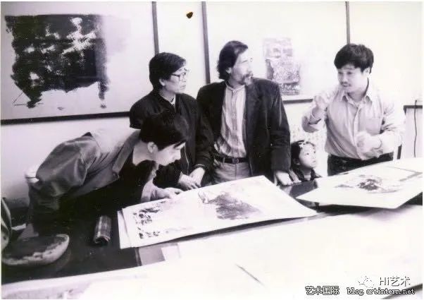 左起:時任中央美術學院版畫系副主任的吳長江、時任中國版畫家協(xié)會副主席的譚權書和時任中央美術學院版畫系系主任的廣軍在鄭忠畫室