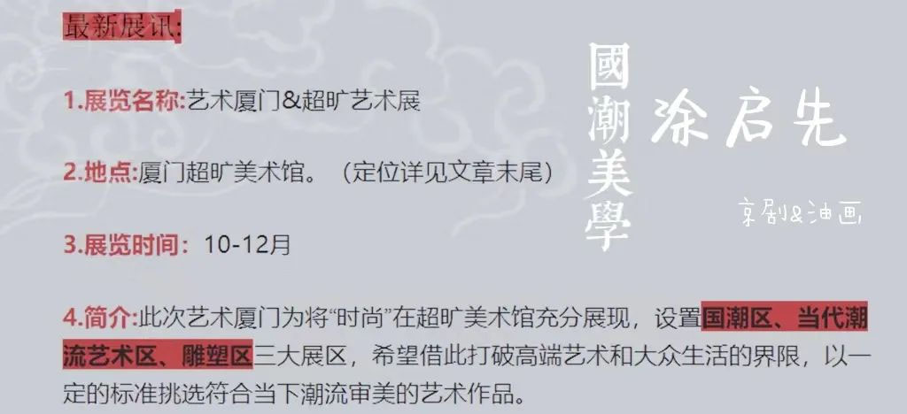“為何你不懂,只要有愛就有痛。有一天你會(huì)知道,人生沒有我并不會(huì)不同?!碑?dāng)這首《當(dāng)愛已成往事》響起的時(shí)候,你是否又想重溫經(jīng)典電影《霸王別姬》?在涂啟先老師的筆下,你便可以看到霸王的悲壯和虞姬的深情。如果說京劇是中國(guó)傳統(tǒng)文化里濃墨重彩的一筆,那么涂啟先老師則用油畫的濃墨重彩描繪出了京劇中的生旦凈末丑,唱念做打癡。歡迎大家來到藝術(shù)廈門&超曠藝術(shù)展,現(xiàn)場(chǎng)感受京劇與油畫的激情碰撞。