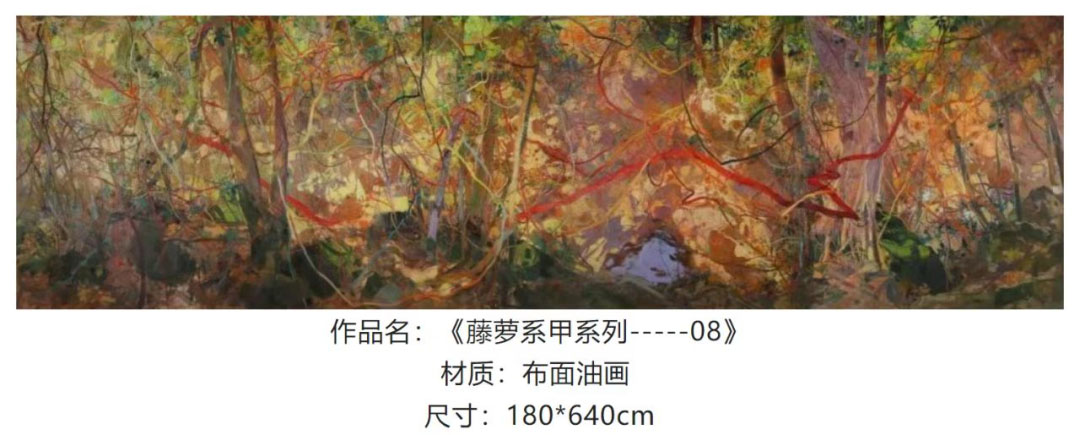 本次參展的油畫系列作品除了《京劇國(guó)粹系列》外還有《藤蘿系甲系列》作品,該系列作品講述的是森林里樹藤纏繞的畫面,極具表現(xiàn)力和生命力。