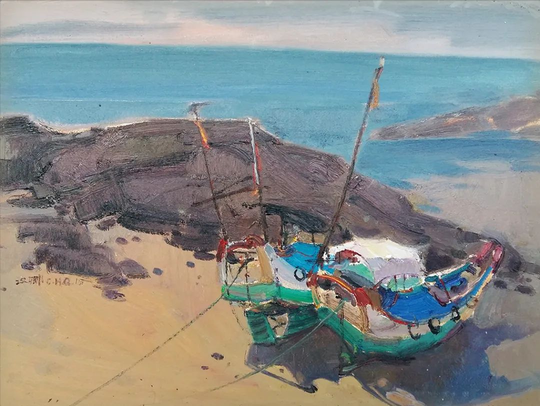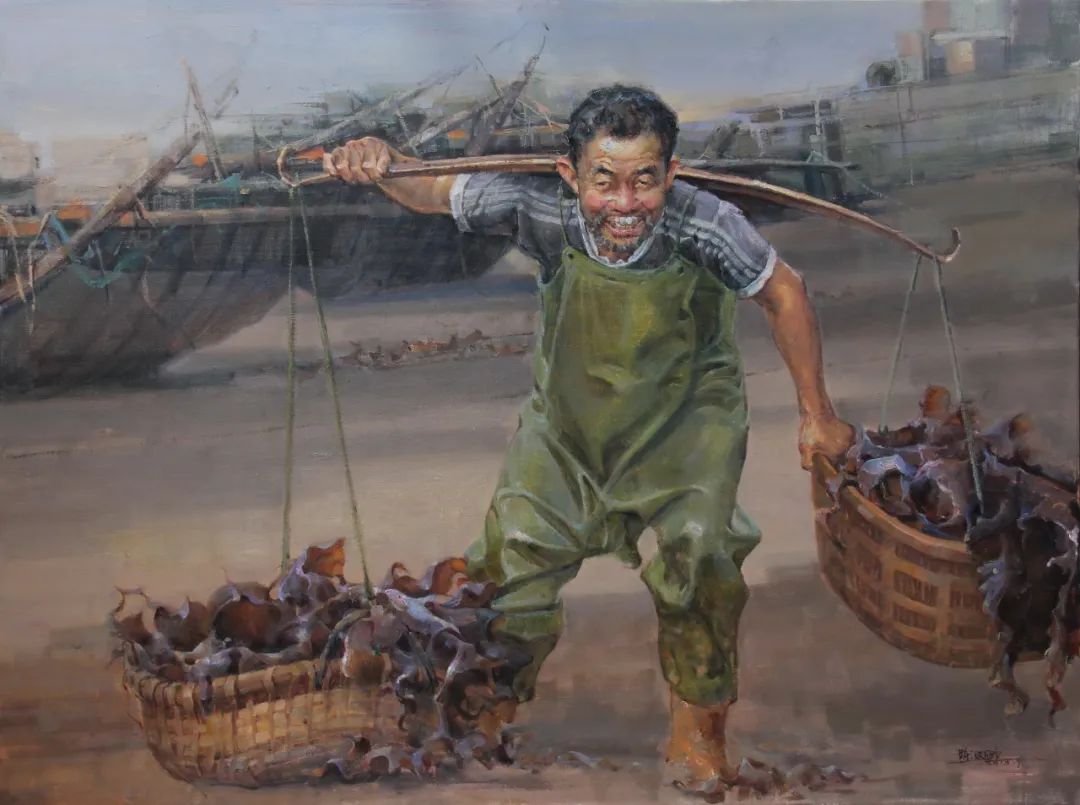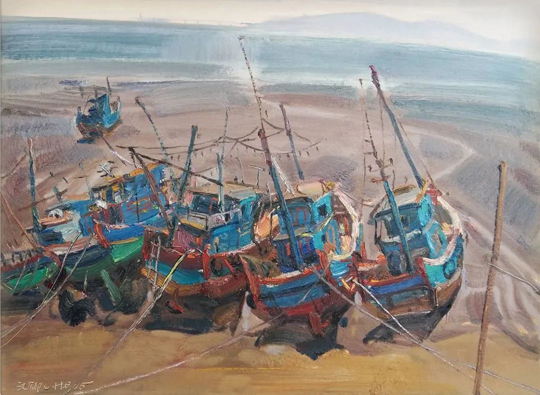 于是漢卿畫海,畫船,畫有關(guān)海的種種景象,更像是一種撓癢癢的方式。"夫畫者從于心者也",畫作就如畫家內(nèi)在生命的感性形態(tài),每幅作品仿佛都是情感癢到極至而玩命撓的一種非常體驗,難言之"癢"必欲言之,于是其筆下就出現(xiàn)了滿口銀牙閃著白光的村里老漁民沖你咧著嘴,慈祥而又憨厚地笑;清晨拂著海風的漁家父子攜手豐收海帶,帶著歲月體溫的暖暖畫面;騎著沙灘土三輪車偶爾偷個懶,刷下微信朋友圈的鄰居小伙;永載著海島人祖祖輩輩逐海踏浪之夢的現(xiàn)代鐵管泡沫船與破舊木舟……嗯!海的種種,很具象又賦予夢幻。而作為畫家,他自然而然地把自身生命中內(nèi)在的自發(fā)性意識融入到油畫創(chuàng)作中,似乎成為一種生命的情結(jié)。