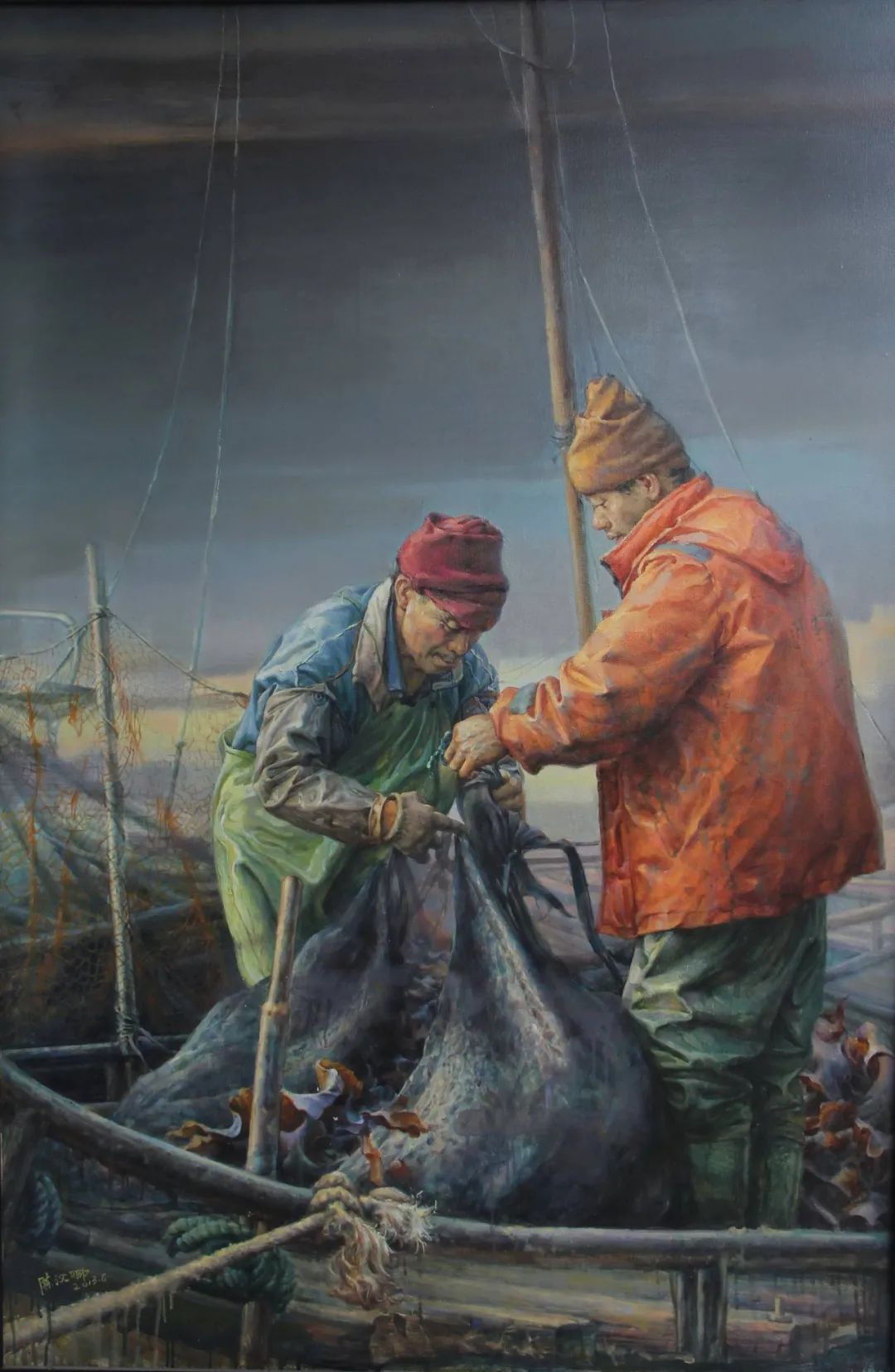 具象也好,意象也罷。"形式內(nèi)涵"自然走向"精神內(nèi)涵",這是一種生命的召喚與升華。"藝術(shù)是一個心靈體驗,一個人有著人格外衣的更高等生命,一個靈魂,在肉眼看不到的情況下,誕生于人的心中。"漢卿的油畫作品在刻畫著一群有著自我追求的新時代漁民,他們在呢喃敘述著生命的種種細節(jié)、感受乃至內(nèi)涵,正如其自己的藝術(shù)歷程。繪畫作品終究是畫家內(nèi)在精神探索的圖像式解讀,它總需有感而發(fā)的。傳統(tǒng)也好,當代也罷,終歸在思維上是需要切入對生活與藝術(shù)融合的電源。漢卿對海的關(guān)注實際上不僅是血脈天性,更是他多年來細膩地思索著時代及生命變遷的一種反映……