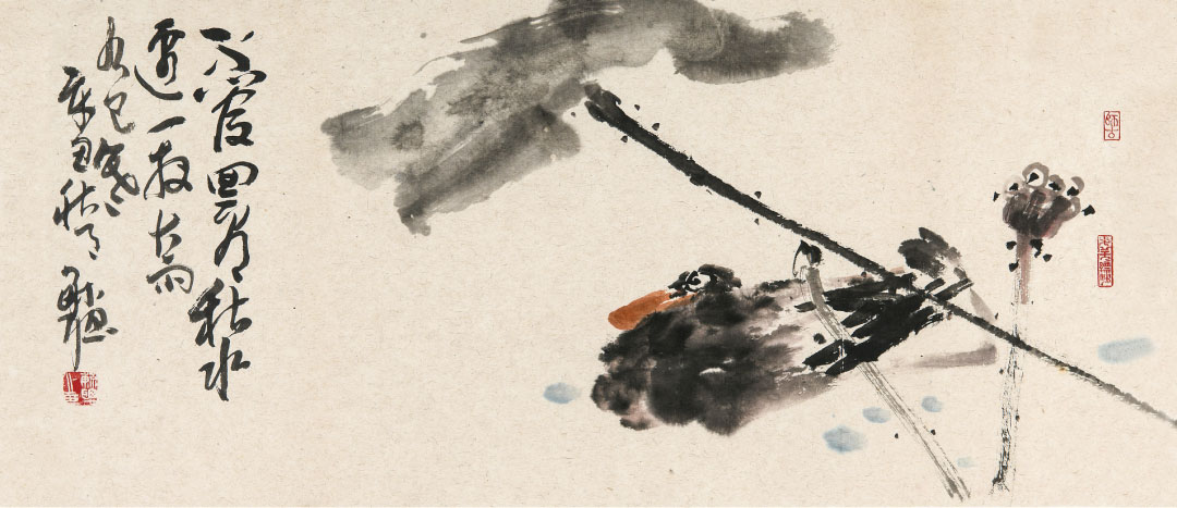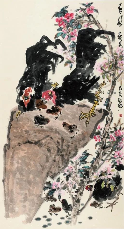 其藝術博綜集粹,淵源廣大,由近現(xiàn)代之吳昌碩、齊白石、潘天壽諸巨匠,追溯至揚州八怪、八大山人、青藤白陽,悉為己用,蔚為一家。