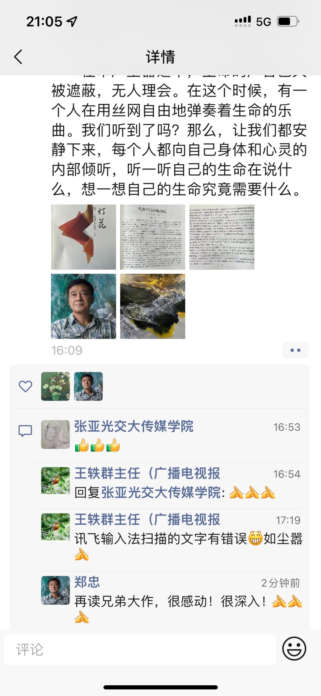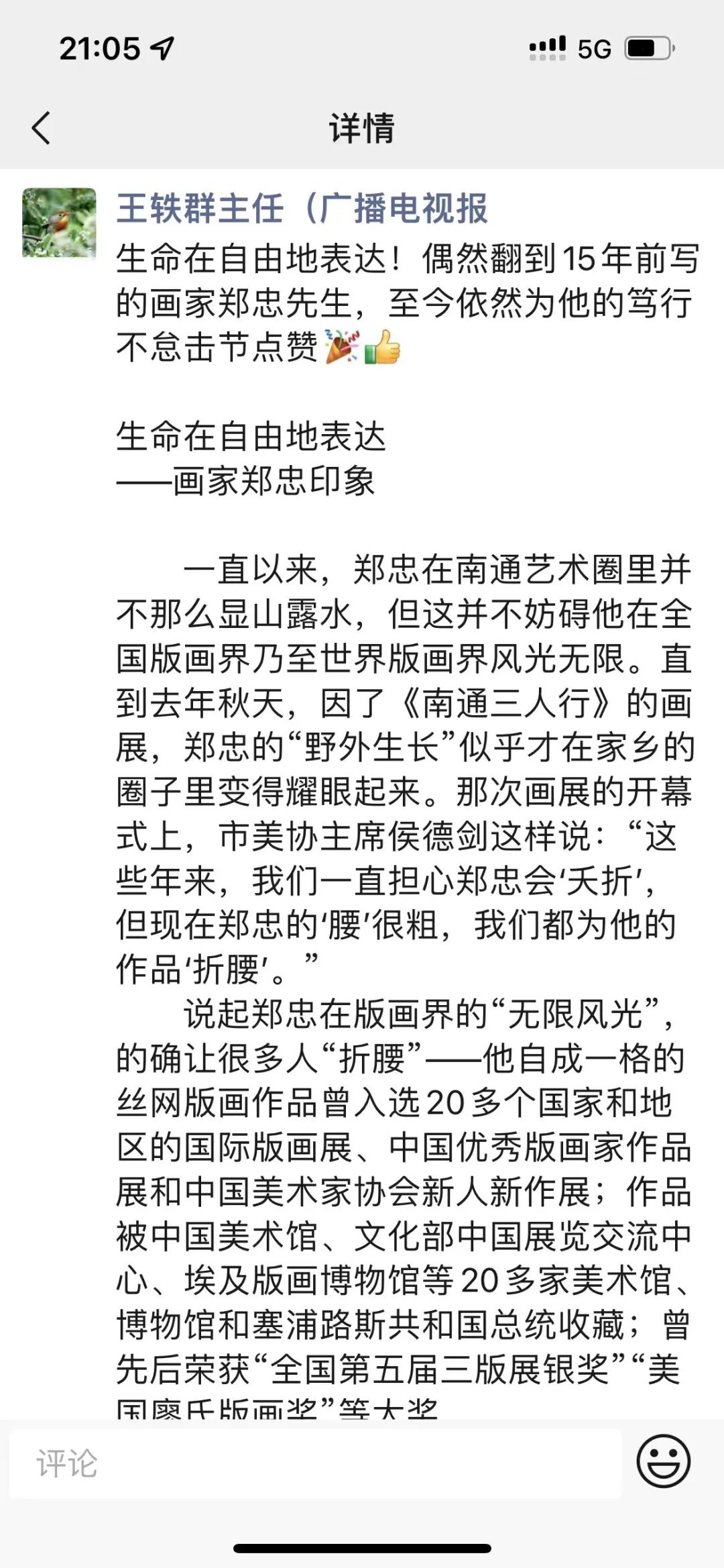 下午在523園區(qū)畫室收到學(xué)弟南通廣電傳媒集團(tuán)融創(chuàng)策劃中心主任王義群發(fā)來的圖片,是十五年前他寫我的文章,閱后面壁,情不能已!在行者鄭忠的背后多少雙期待的眼光?半輩子人生是江東父老兄弟姐妹們的默默支持、付出才有我這回眸一笑的一點(diǎn)點(diǎn)欣慰。