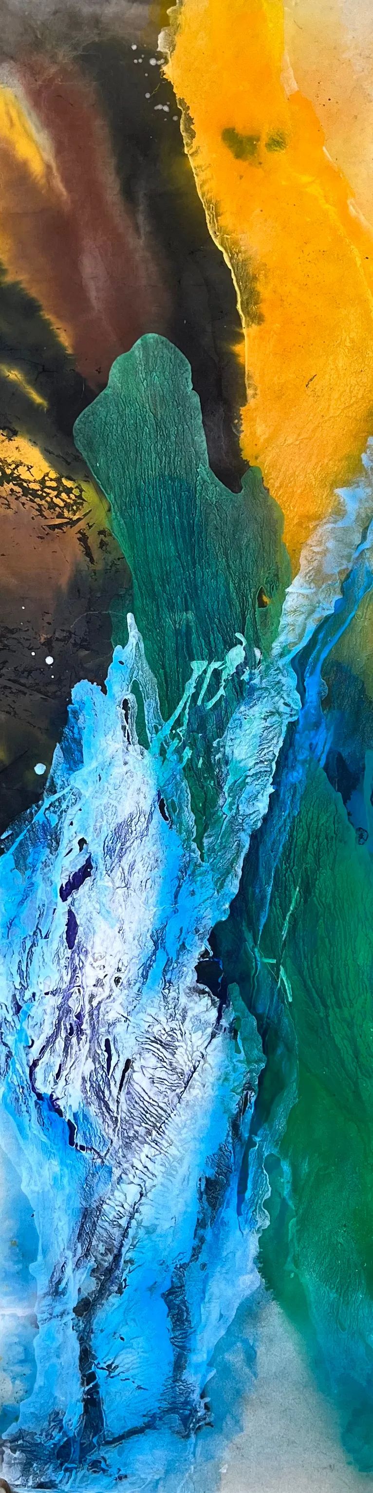 特別是“正是二十多年不帶功利目的的自由表達(dá)……”這段話讓我感慨系之,我仿佛一直生活在自己的夢境里,為那西西弗西的神話而日夜兼程,在我“邂逅”抽象水墨(包括山水畫)之前就有了業(yè)內(nèi)人士感到的“不可思議”,這是獨(dú)特藝術(shù)歷程的生命體驗(yàn)與觸摸,是非同凡響的人生“沉淀”,他見證了“抽象水墨畫家鄭忠”之前的“版畫家鄭忠”,而版畫家之前的鄭忠又脫胎于“工程師”“發(fā)明家”“設(shè)計(jì)師”鄭忠,但此時的鄭忠藝術(shù)受“潛水員鄭忠”的渲染是默默地,間接的,到了抽象水墨畫家之后,二、三十年前受天風(fēng)海水的熏陶與海洋深處的洗禮而直接彰顯出藝術(shù)家鄭忠經(jīng)歷坎坷、波瀾壯闊、洶涌澎湃的生命底色。他當(dāng)時把握的相當(dāng)準(zhǔn)確!